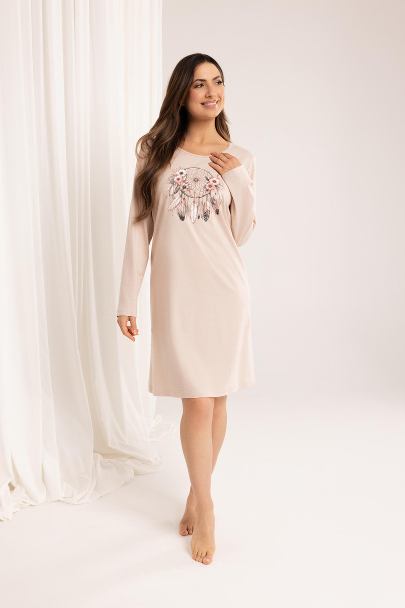 Dámska nočná košeľa 162 J/25 - klasický tvar a farebný akcent Nočná košeľa 162 J/25 je klasickou voľbou pre ženy, ktoré oceňujú pohodlie pri spánku a prírodné materiály. Je vyrobená z kvalitnej 100 % bavlny, je mäkká, priedušná a príjemná na pokožku. Model má dlhé rukávy, polkruhový výstrih a dĺžku po kolená, takže je vhodný na každé ročné obdobie. Farebná potlač na prednej strane dodáva košeli dievčenský a veselý charakter. Ideálna na spanie a večerný relax.