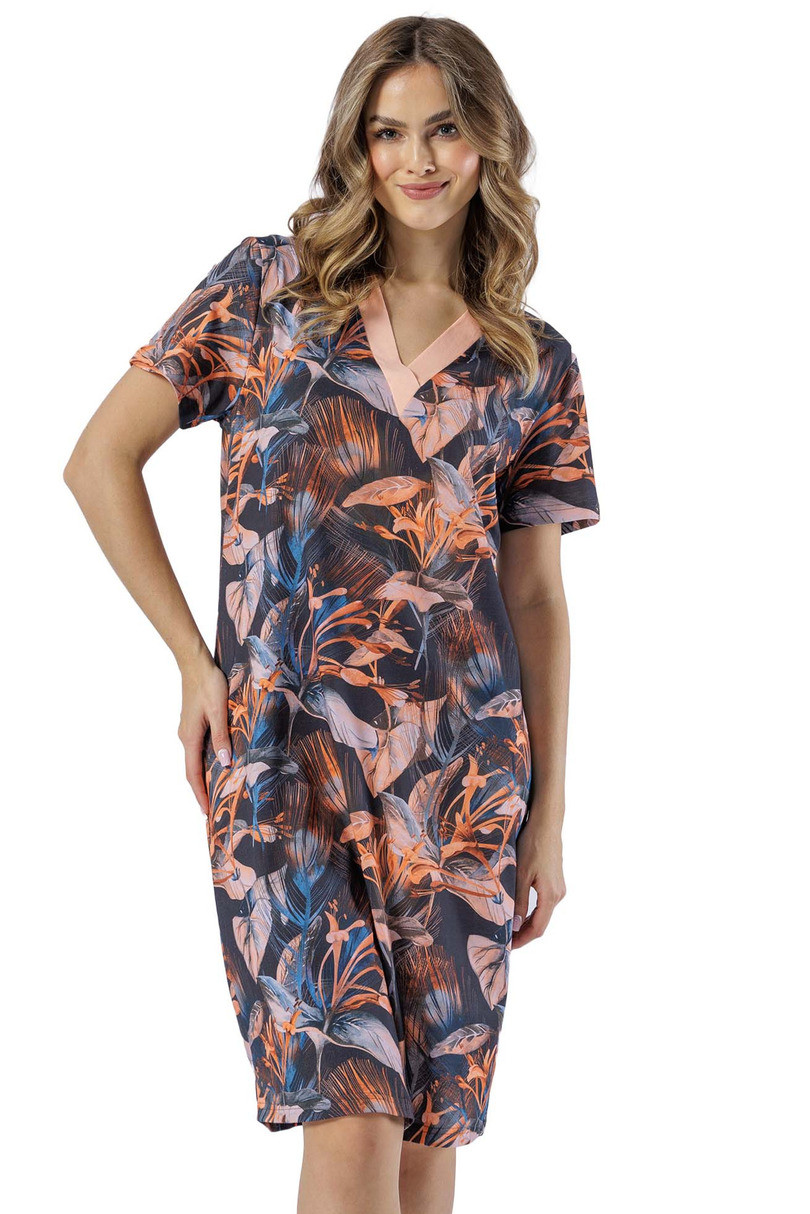 Dámske tričko s krátkym rukávom zo vzorovanej bavlny, výstrih s kontrastným lemovaním, dĺžka po kolená.Materiál: 100% bavlna .