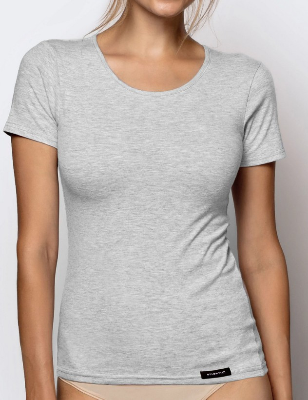 Bavlnená dámska košieľka s krátkymi rukávmi. Model má polkruhový výstrih, ploché švy a jemné obšitie. Zloženie: 95% bavlna, 5% elastan.