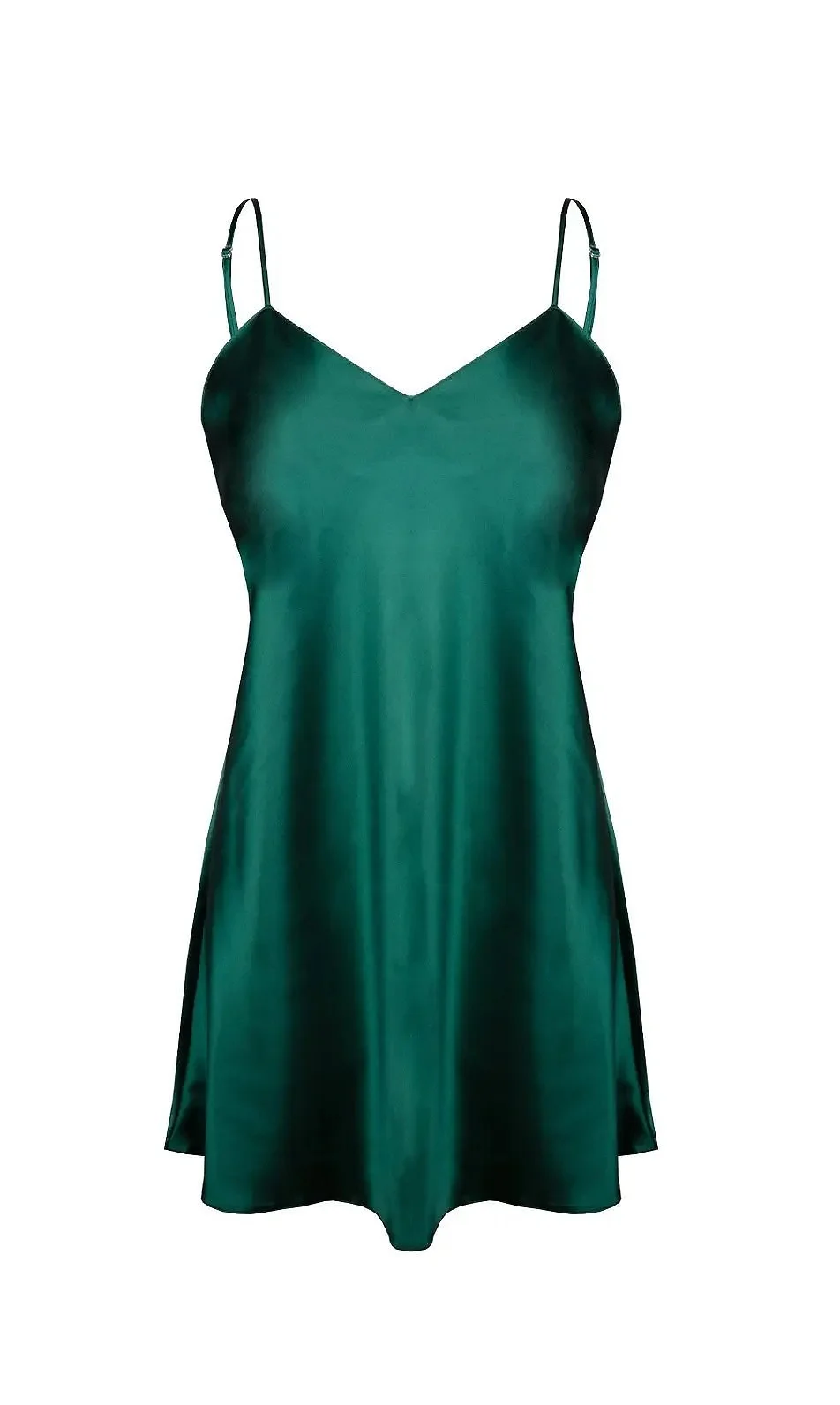 Krátka hladká dámska saténová nočná košieľka/spodnička. Košieľka má výstrih v tvare písmena "V". Dĺžku tenkých ramienok je možné nastaviť. Model sa smerom dole ľahko rozširuje. Košieľka je v predaji v širokej palete farieb.Zloženie: 100% polyester.