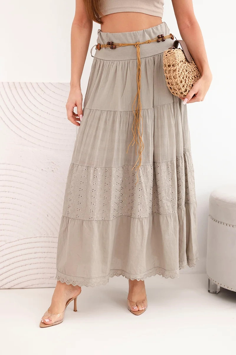 Dámska maxi sukňa je výbornou voľbou pre ženy, ktoré ocenia pohodlie, ľahkosť a módny vzhľad na každý deň. Model je vyrobený z prírodnej bavlny, vďaka čomu je ideálny na teplejšie dni, poskytuje pohodlie pri nosení a voľnosť pohybu. Dlhý strih krásne splýva na postave a rozšírený strih dodáva celku ľahkosť a ženský charakter. Je to ideálna dámska sukňa na jar, leto a dovolenku. Dobre sa hodí k jednoduchému topu, ako aj k voľnej blúzke alebo ľahkému svetru. Ozdobné prešívanie a čipková vsadka jej dodávajú jemný pôvab a elastický pás zaručuje dobré prispôsobenie sa postave. Ďalšou výhodou je ozdobný opasok, ktorý zdôrazňuje boho štýl a dodáva celku módny vzhľad. Talianska výroba zaručuje starostlivé spracovanie a módny dizajn inšpirovaný najnovšími trendmi. Veľkosť je univerzálna a padne dámam vo veľkosti S, M alebo L (obvod od 72 cm do 104 cm). dlhý maxi strih ľahká a priedušná bavlnená tkanina elastický pás ozdobný pásik v páse čipkované lemovanie rozšírený strih pohodlné na každodenné nosenie boho štýl Talianska výroba Zloženie materiálu: materiál: 100% bavlna Rozmery:Rozmery uvedené nižšie sú merané na plocho +/- 1 cmAk chcete získať obvod, vynásobte šírku dvomi Šírka v páse: 36 cm / po natiahnutí: 52 cm (obvod od 72 cm do 104 cm) Celková dĺžka: 97 cm Šírka v oblasti bokov: 65 cm