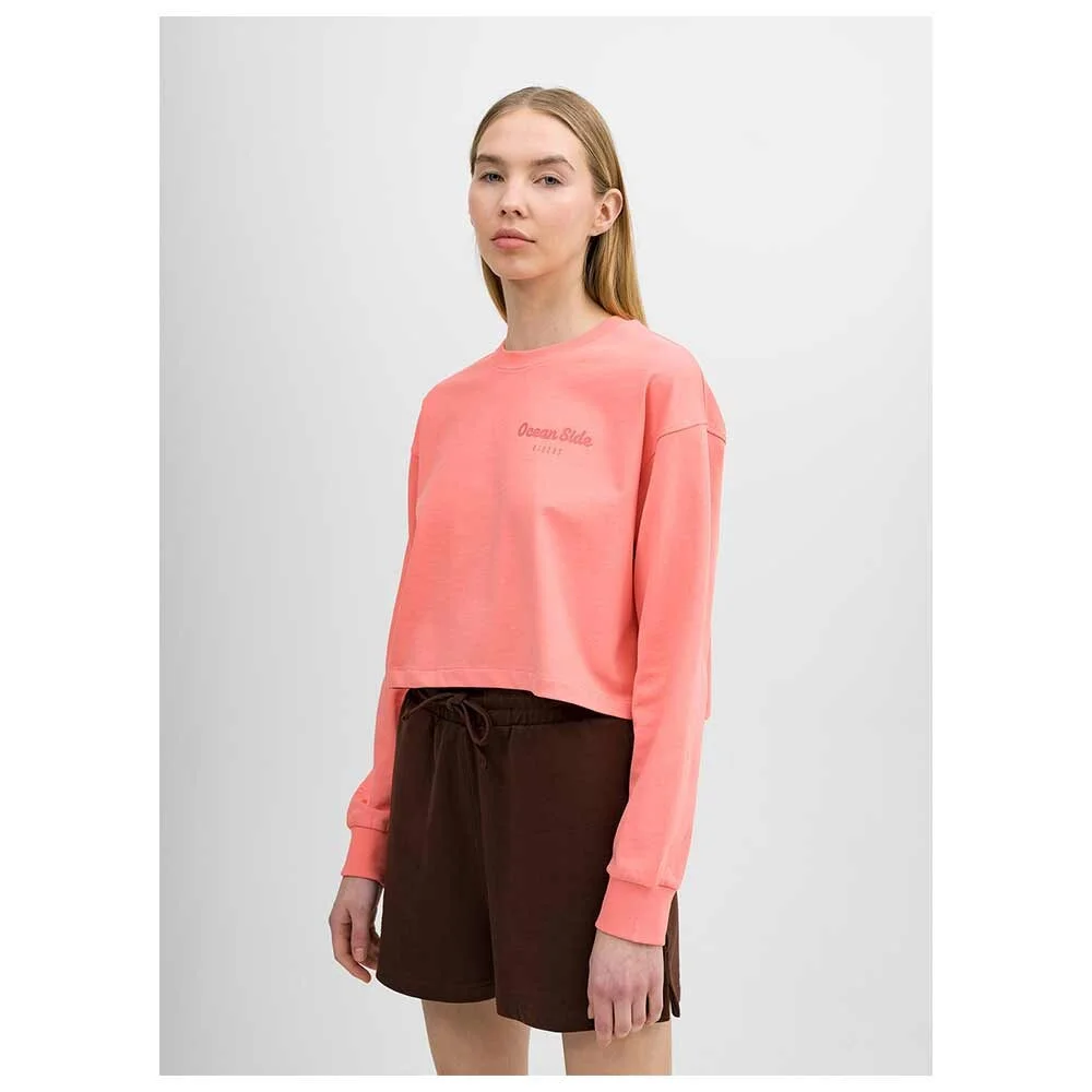 Táto štýlová dámska mikina je ideálna na nosenie vo voľnom čase. Mikina má moderný strih, dlhé rukávy s elastickými manžetami a okrúhly výstrih. Jemné minimalistické logo "Oceanside" sa nachádza na ľavej strane hrude. Veľká retro potlač so slnkom, morskými vlnami a motívom "FOLLOW THE SUN", ktorá dodáva mikine letnú a pozitívnu atmosféru. Mikina je ideálna na kombinovanie s džínsami s vysokým pásom, šortkami alebo legínami a bude skvelým doplnkom ležérnych a športových outfitov.