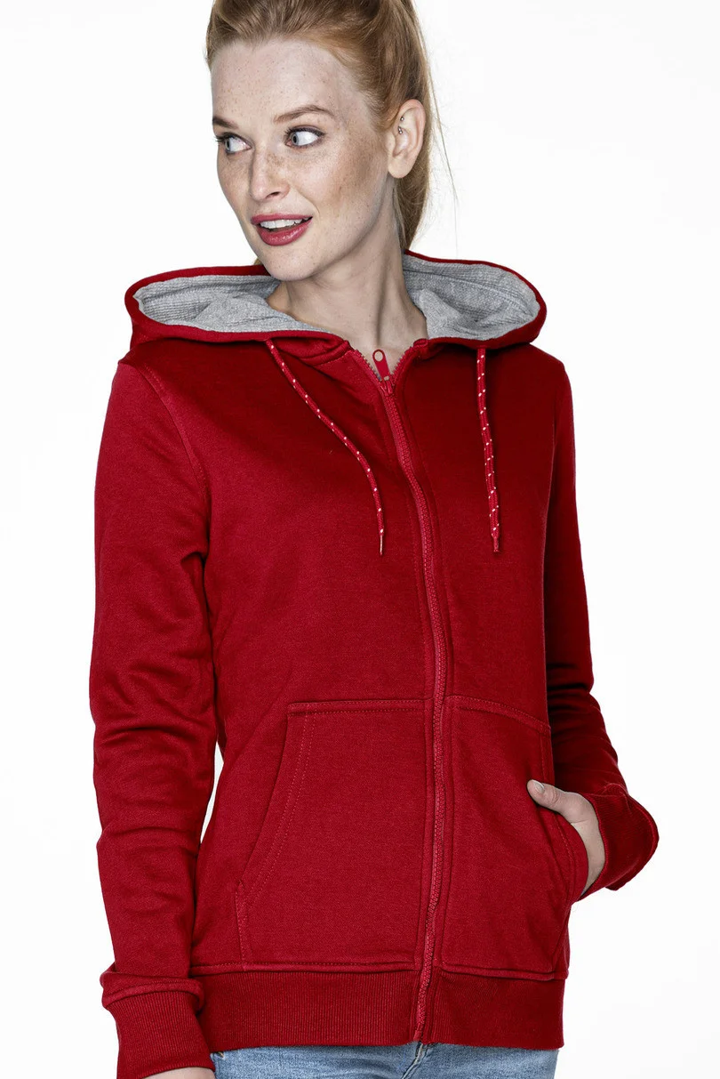 Dámska mikina s kapucňou. Vo vnútri je česaný materiál, zvonku má protižmolkovou úpravu. Kapucňa podšitá kontrastným materiálom. Kapucňa má reguláciu. Hlavný zips je plastový. Vpredu dve veľké vrecká. Rukávy sú zakončené elastickým lemom. Zloženie: 80% bavlna, 20% polyester. Gramáž: 250g / m2