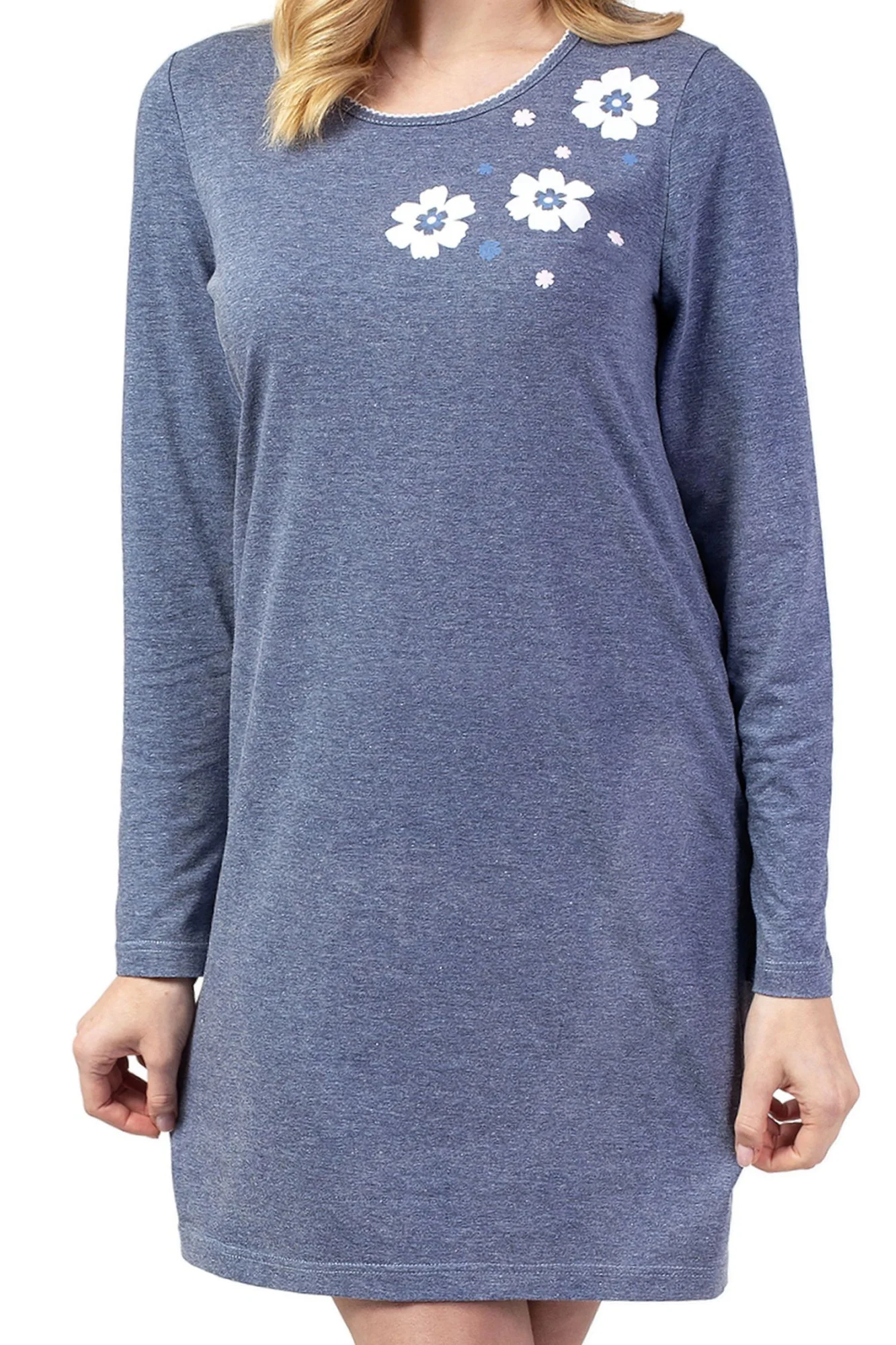 Dámska nočná košeľa 141 blue REGINA - tmavomodrá - vyrobená z kvalitnej bavlny - zdobená potlačou na prednej strane - dlhé rukávy Zloženie materiálu: 100% bavlna Veľkosti pre ženy S M L XL 2XL 3XL 4XL Obvod hrudníka (cm) 84 cm 90cm 96cm 102cm 108cm 116cm 124cm Obvod bokov (cm) 91cm 96cm 102cm 107cm 113cm 120cm 128cm Výška (cm) 160cm 164cm 168cm 168cm 164cm 164cm 164cm Veľkosti pre mužov M L XL 2XL 3XL Obvod hrudníka (cm) 100 cm 104cm 108cm 112cm 122cm Obvod bokov (cm) 90cm 94cm 98cm 104cm 114cm Výška (cm) 172cm 178cm 182cm 184cm 184cm
