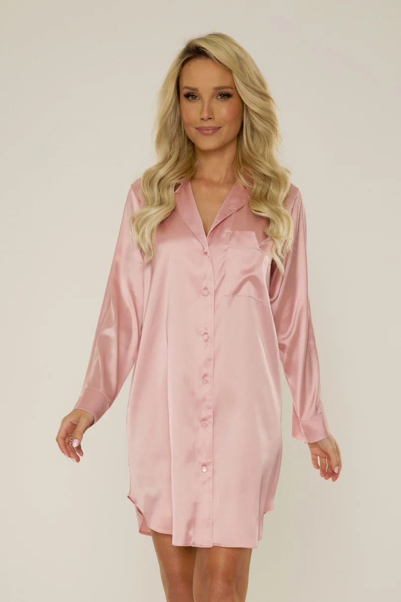 Dámska saténová košeľa s dlhými rukávmi, rozopnutá, s vreckom na hrudi. Výrobok zabalený v krabici. Zloženie: 97% polyester, 3% elastan