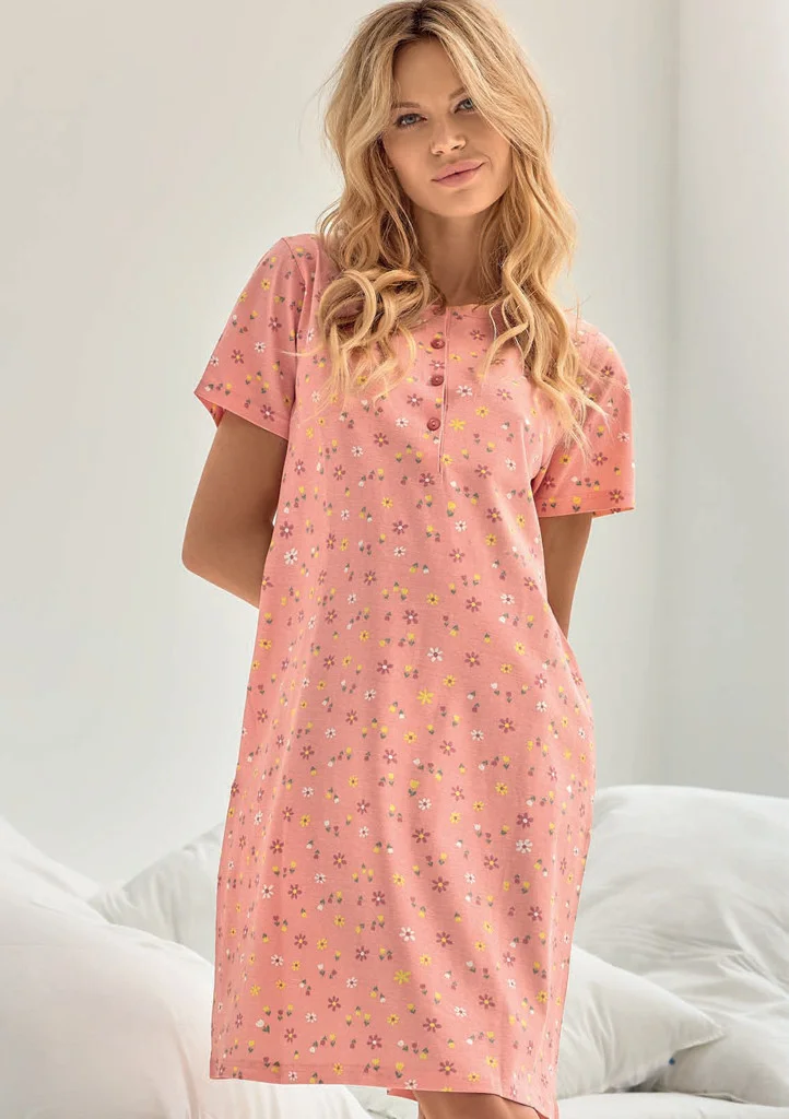 Dámska nočná košeľa Infiore v jemnej marhuľovej farbe s drobnou kvetinovou potlačou je ideálna na pokojné a pohodové noci. Krátke rukávy a okrúhly výstrih s praktickým zapínaním na gombíky zvyšujú pohodlie a zároveň dodávajú nočnej košeli jemný nádych. Ľahký, priedušný materiál je príjemný na nosenie a zaručuje pohodlie počas celej noci. Doprajte si nádych ženskosti a romantiky s touto krásnou nočnou košeľou, ktorá vás očarí svojou jemnosťou. 100 % bavlna.