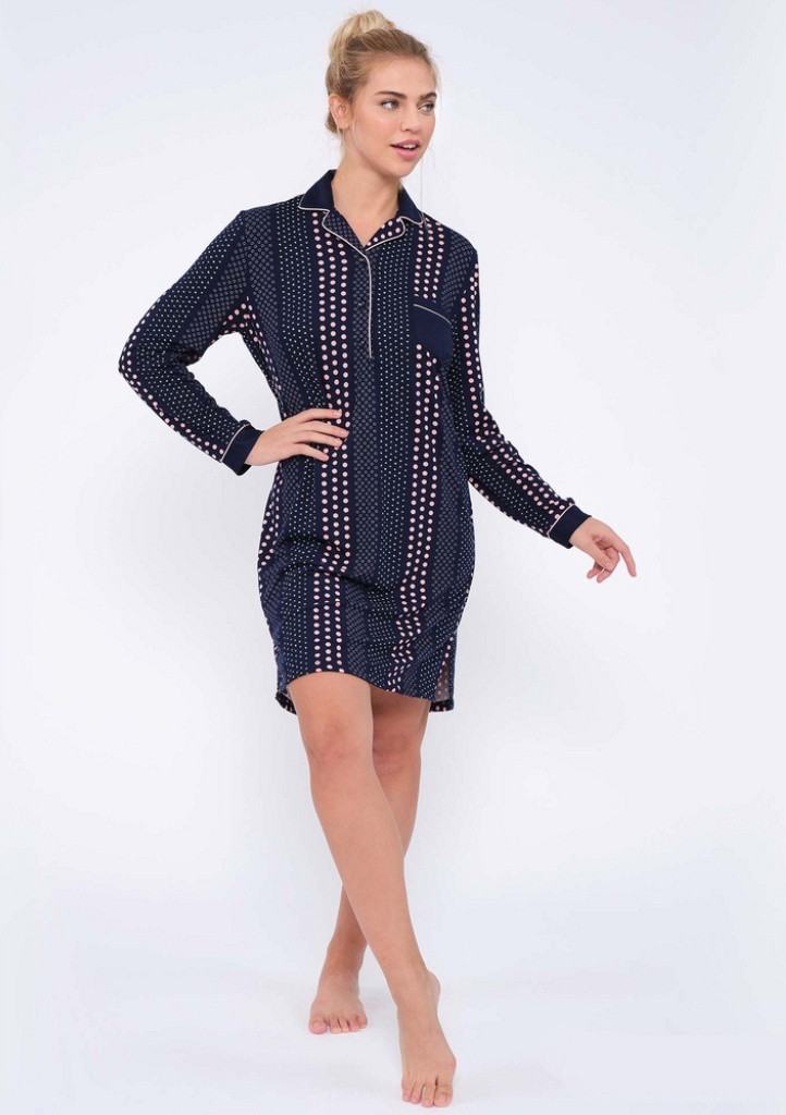 Dámska nočná košeľa španielskej značky Muydemi. Košeľa má golier a pás s tromi gombíkmi okolo krku, golier a pás je lemovaný saténovým pásikom. Na ľavej strane je všité vrecko. Na bokoch košele sú rozparky. Košeľa je vyrobená z príjemného, česaného materiálu. Zloženie materiálu: 95 % polyester, 5 % elastan