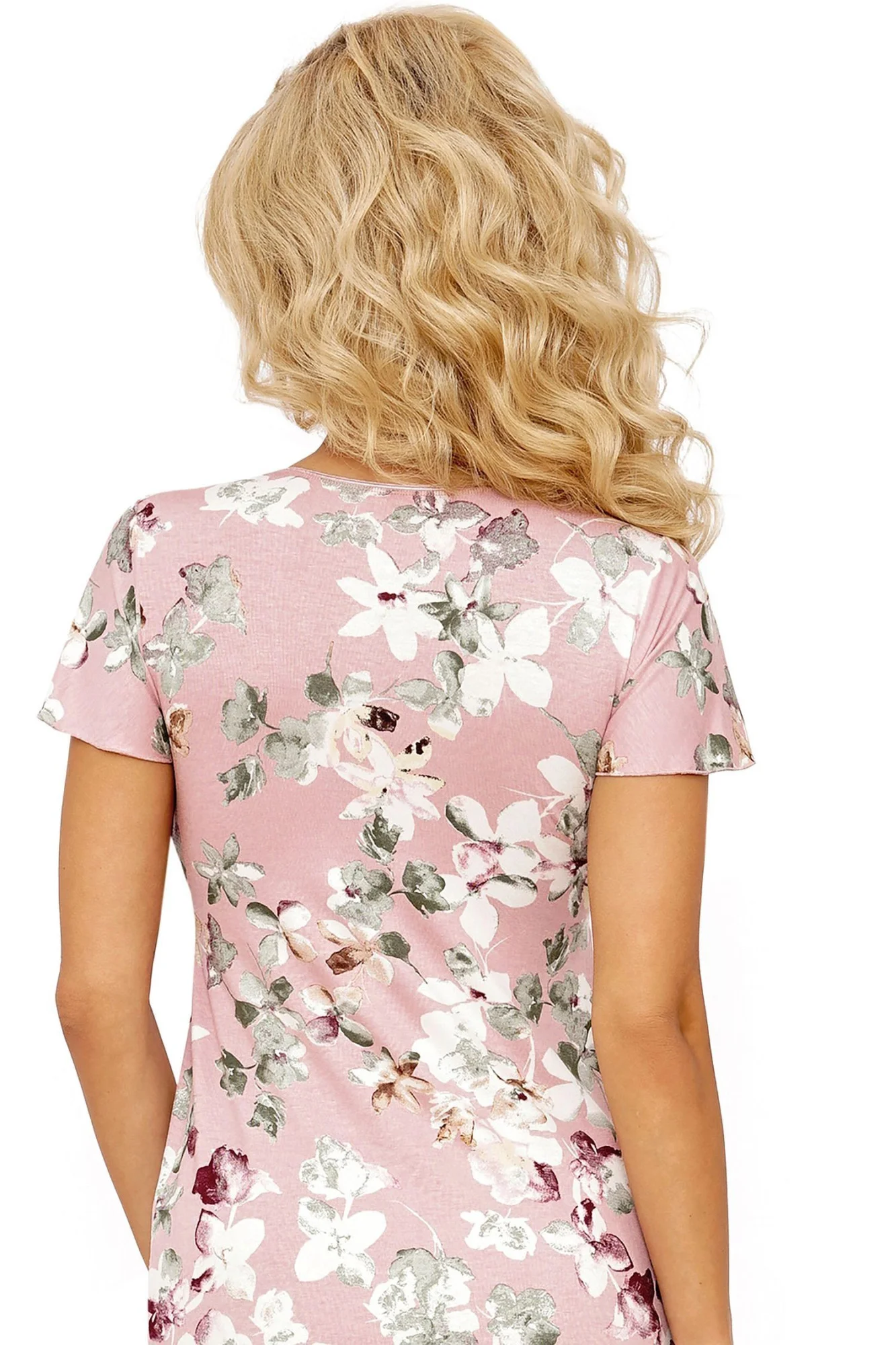 Dámska nočná košeľa Nicola Donna - ružová - vyrobená z kvalitnej viskózy - kvetinová potlač - hlboký výstrih - nariasenie pod prsiami - krátke rukávyZloženie materiálu: 95% viskóza + 5% elastan