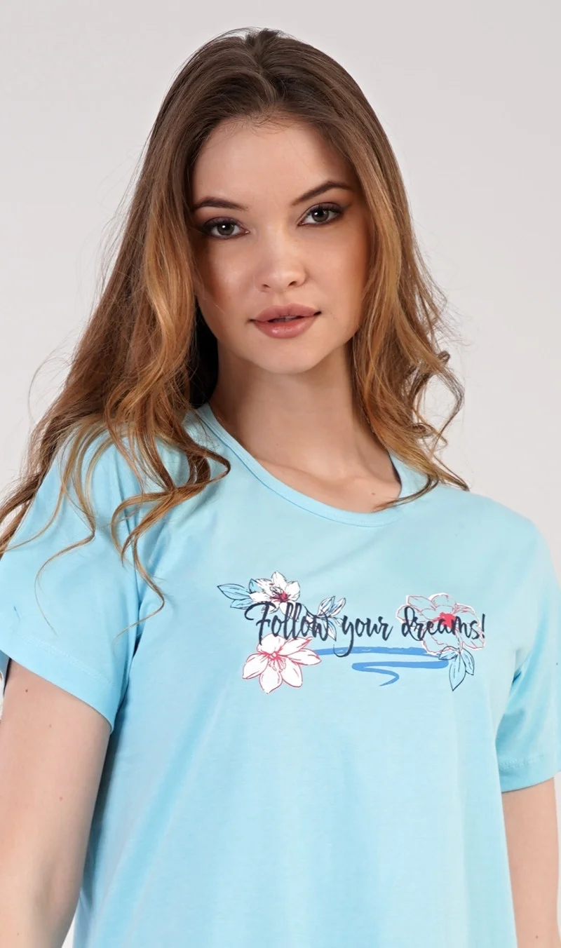 Dámská bavlněná noční košile s krátkým rukávem Ella. Noční košili s kulatým výstřihem zdobí obrázek květů a malý nápis 'Follow your dreams'. Použitý bavlněný materiál je příjemný a poddajný na dotek.