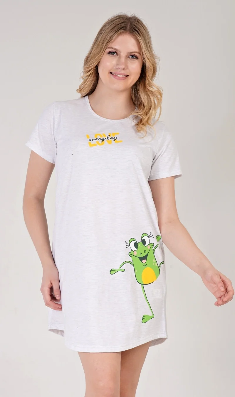 Dámská noční košile s krátkým rukávem Frog. Noční košile s kulatým výstřihem má ve spodní části na boku obrázek veselé žabky a na prsou nápis LOVE EVERYDAY. Použitý materiál s podílem bavlny 70% je příjemný a poddajný na dotek. Pokyny pro údržbu: -70% bavlna, 30% polyester - lze prát v pračce při teplotě do 30° - nesušit v sušičce - žehlit z rubu do 110° - nepoužívat bělící prostředky - nečistit chemicky Míry naměřené na výrobku: 2123320000 Frog S M L XL obvod hrudníku 94 98 102 106 obvod boky 110 114 118 122 délka 90 90 90 90