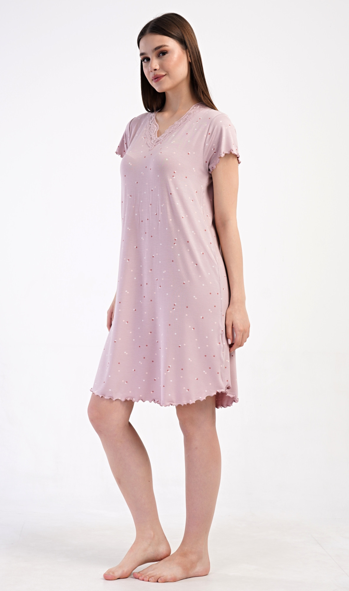 Dámská noční košile s krátkým rukávem Isabela. Noční košile s příjemnou délkou po kolena má žlábkování na rukávech a spodním lemu, výstřih je ozdoben krajkou. Na látce košile jsou natištěny drobné puntíky. Použitý viskózový materiál s příměsí lycry je příjemný a poddajný na dotek. Pokyny pro údržbu: - 95% viskoza, 5% lycra - lze prát v pračce při teplotě do 30°- nesušit v sušičce- žehlit z rubu do 110°- nepoužívat bělící prostředky- nečistit chemicky Míry naměřené na výrobku: 4093131049 Isabela S M L XL obvod hrudníku 86 90 94 98 obvod boky 90 102 106 110 délka 88 88 88 88