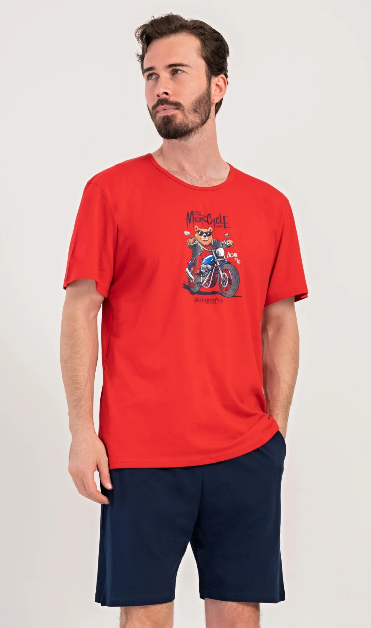 Pánské bavlněné šortkové pyžamo Motorkář. Pánské pyžamo se skládá z trička s krátkým rukávem a krátkých šortkových kalhot. Na jednobarevném tričku je obrázek medvěda na motorce a nápis 'Motorcycle'. Šortky mají praktické kapsy, v pase gumu a šňůrku na stáhnutí. Použitý materiál s podílem bavlny 100% je příjemný a poddaný na dotek. Pyžamo je vhodné i na denní nošení a oceníte ho obzvlášť v horkých letních dnech. Pokyny pro údržbu: - 100% bavlna- lze prát v pračce při teplotě do 30°- nesušit v sušičce- žehlit z rubu do 110°- nepoužívat bělící prostředky- nečistit chemicky Míry naměřené na výrobku: 4084390000 Motorkář S M L XL obvod hrudníku 102 106 110 114 délka trika 70 71 72 73 pas 76-88 78-90 80-92 82-94