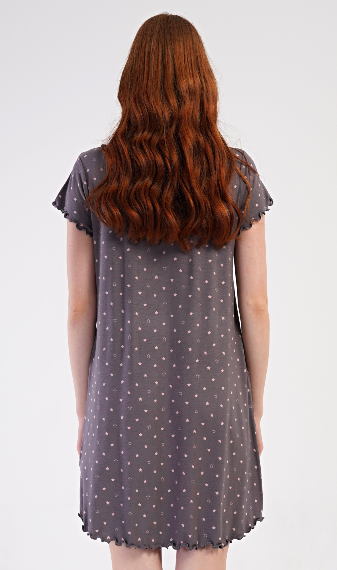 Dámská noční košile s krátkým rukávem Samanta. Noční košile má příjemnou délkou nad kolena a ozdobné žlábkování okolo rukávů a spodního lemu. Výstřih je ozvláštněn jemnou krajkou. Košile s krátkým rukávem je potištěna hvězdičkami. Použitý materiál ze směsi viskózy a lycry je příjemný a poddajný na dotek. Pokyny pro údržbu: - 95% viskoza, 5% lycra - lze prát v pračce při teplotě do 30°- nesušit v sušičce- žehlit z rubu do 110°- nepoužívat bělící prostředky- nečistit chemicky Míry naměřené na výrobku: 4092920835 Samanta 1XL 2XL 3XL 4XL obvod hrudníku 108 112 116 120 obvod boky 118 120 124 128 délka 88 89 90 91