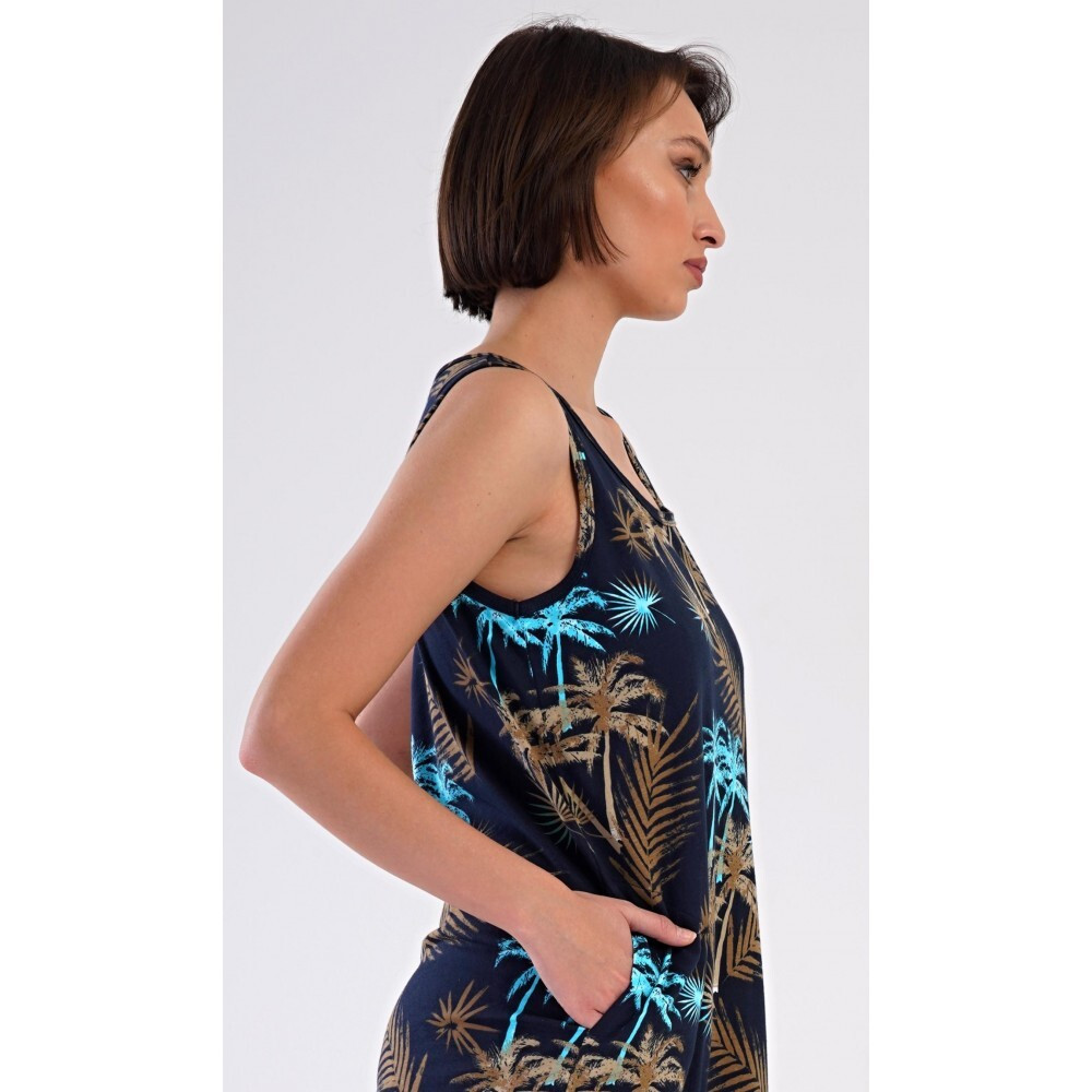 Bavlnená dámska nočná košeľa bez ramienok Tropicana. Nočná košeľa so širšími ramienkami a okrúhlym výstrihom má praktické vrecká a je potlačená tropickými palmami. 100 % bavlnený materiál je príjemný a hebký na dotyk. Košeľa je vhodná aj na každodenné nosenie a oceníte ju najmä počas horúcich letných dní. Pokyny na údržbu: Vložte do vrecka a nechajte ho vyniknúť: - 100 % bavlna - možno prať v práčke pri teplote do 30 °C - nesušte v sušičke - žehliť na rubovej strane do 110° - nepoužívajte bieliace prostriedky - chemicky nečistiť Rozmery namerané na výrobku: 4083106319 Tropicana S M L XL obvod hrudníka 92 94 98 102 obvod bokov 98 102 106 110 dĺžka 90 91 91 91