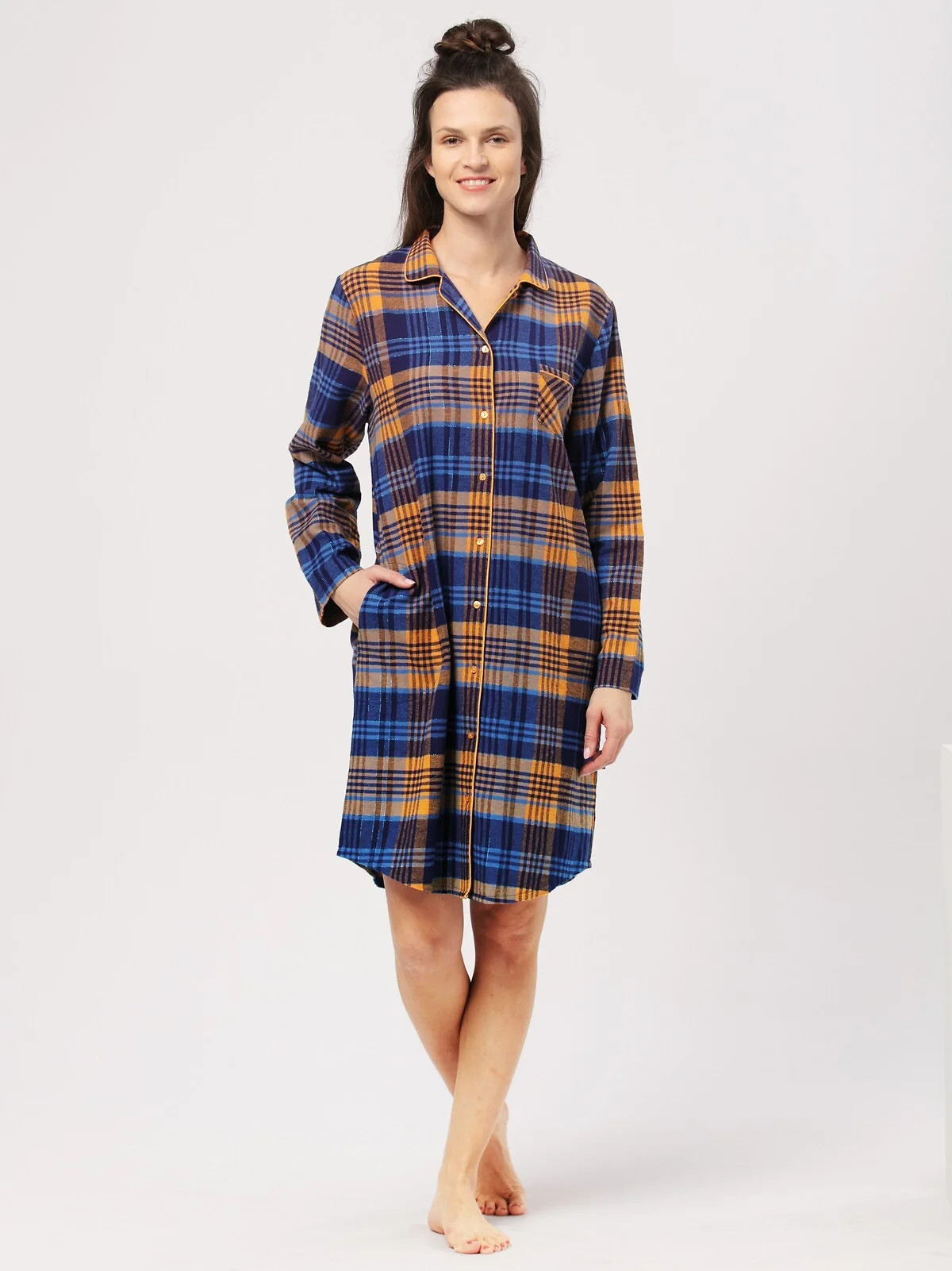 Dámská noční košile z vysoce kvalitního flanelu kostkovaný vzor zdobený lesklou nití zapínání na knoflíky s límečkem dlouhé rukávy pohodlné kapsy v pase délka před kolena Materiálové složení: 100% bavlna