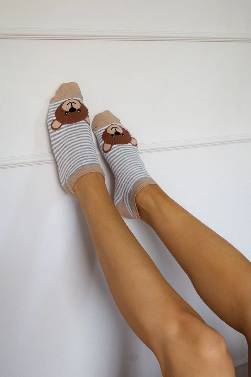 Vyjadrite svoj štýl s týmito rozkošnými dámskymi pruhovanými ponožkami s medvedíkmi! Tieto jedinečné ponožky spájajú pohodlie s jedinečným dizajnom - veľkí roztomilí medvedíci a jemné prúžky im dodávajú originálny vzhľad. Sú vyrobené z mäkkej bavlny a poskytujú vynikajúcu priedušnosť a pohodlie počas celého dňa. Vďaka elastickému lemu ponožky dokonale sedia na nohe - sú ideálne na každodennú štylizáciu - do tenisiek aj na domáce relaxovanie..