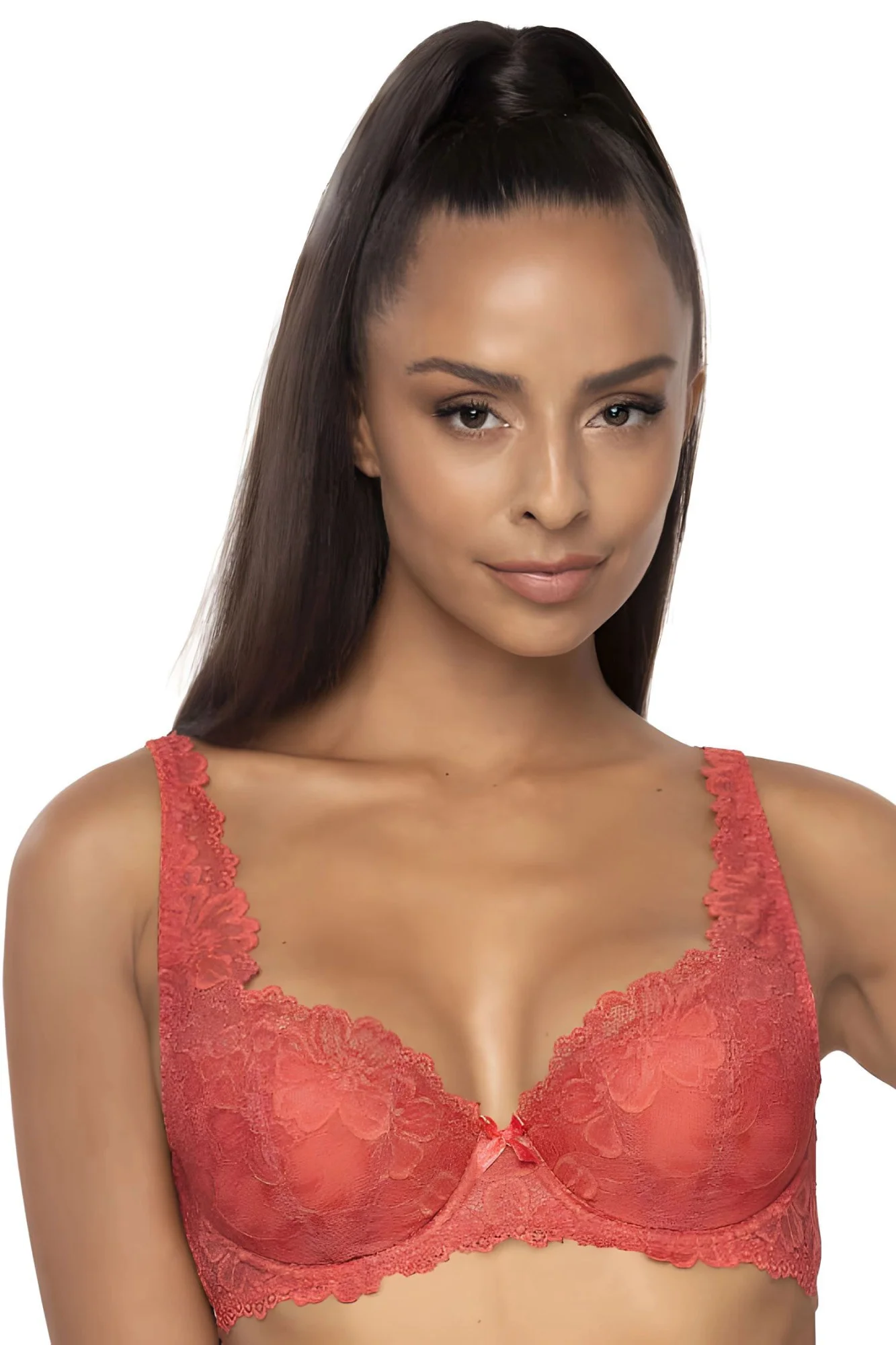 Dámska podprsenka 053/22 Carmela coral MAT - koralová farba - čipka s kvetinovým motívom - vystužená - vnútorná strana košíčkov podšitá bavlnou - bočné časti s kosticami - nastaviteľné a neodnímateľné čipkované ramienka - nadvihuje a drží poprsieZloženie materiálu: 44% polyamid + 18% polyester + 16% bavlna + 16% polyuretán + 6% elastan
