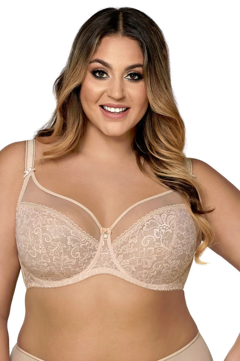 Mäkká podprsenka. Vrchná časť košíčkov je tylová, spodná čipková. Medzi košíčkami je ozdobná perlička. Boky sú ušité z pevnej látky a sú spevnené kosticou. Ramienka sú nastaviteľné, neodopínacie. Zapínanie je na chrbte na kovové háčiky. Materiálové zloženie: 88% poliamid, 8% bavlna, 4% elastan