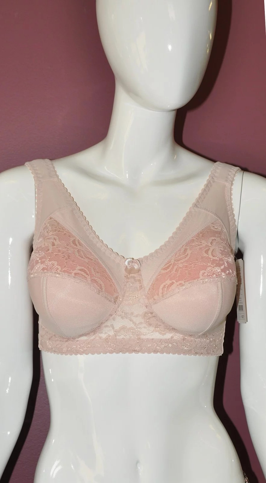 Pohodlná a komfortná dámska podprsenka pre ženy s väčším a plnším poprsím. Mäkké košíčky nemajú kostice. Podprsenka je vyrobená zo sieťoviny a je do polovice podšitá tkaninou. Horná časť košíčkov je priesvitná a je ozdobená čipkou. V mieste spojenia košíčkov je saténová mašlička. Pohodlné široké ramienka sú zárukou komfortu pri nosení. Zloženie: 90% polyamid, 10% elastan.
