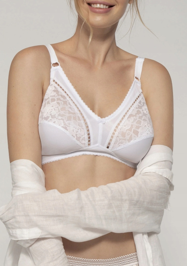 Táto klasická podprsenka bez kostíc od značky Dorina je určená pre dámy, ktoré majú rady pohodlie. Podprsenka je bez kostíc a je mimoriadne pohodlná. Zdobí ju čiastočná čipka s kvetinovým motívom. V oblasti obvodu je vystužená mäkkou gumou, ktorá zabezpečuje, aby poprsie držalo v požadovanej výške. Má mäkké, široké, vpredu dĺžkovo nastaviteľné ramienka, ktoré zabezpečujú pohodlie svojej majiteľky pri nosení. Zapínanie je dvojradové v troch polohách. Materiálové zloženie: 92 % polyamid, 8 % elastan