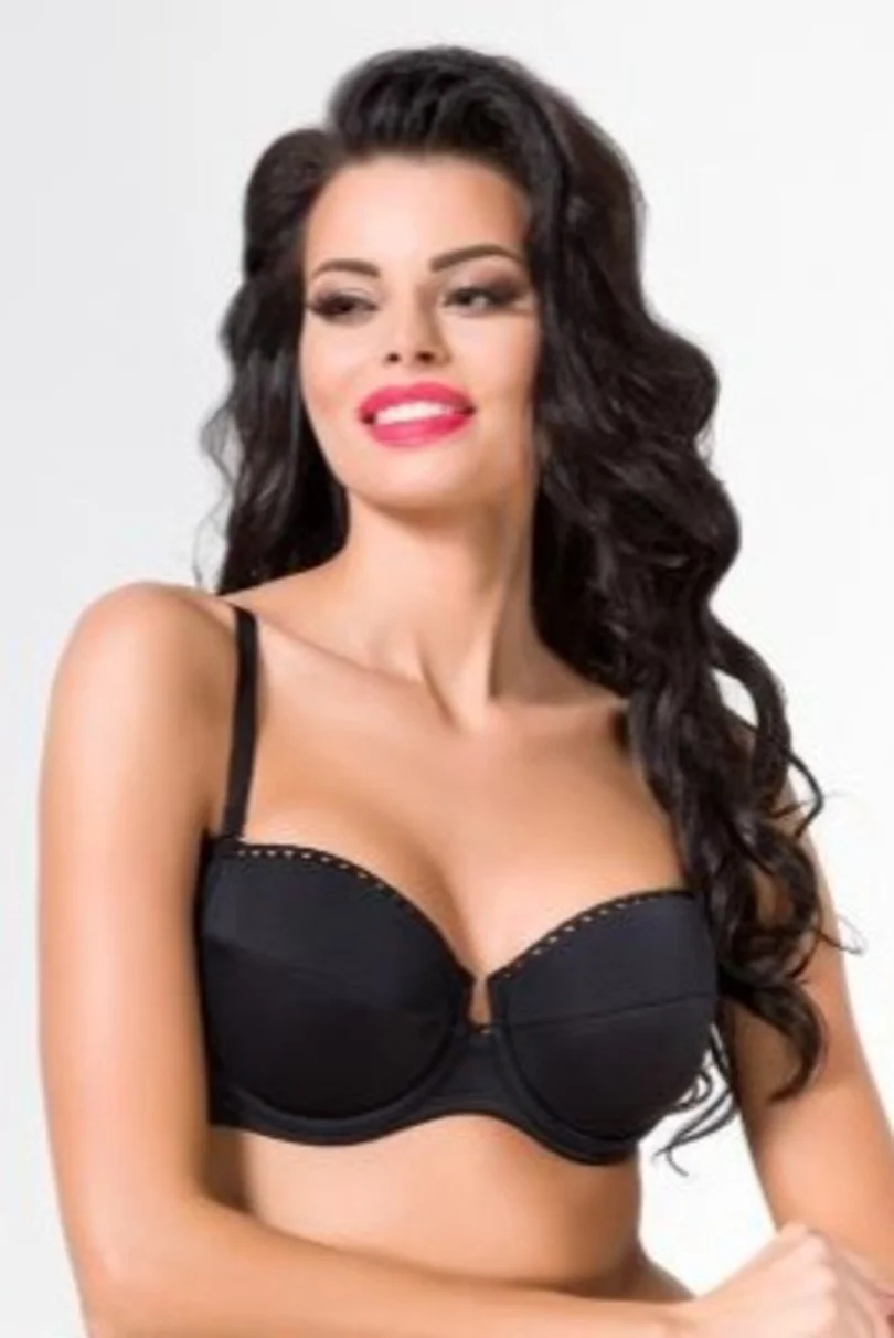Dámska podprsenka s kosticami a vystuženými košíčkami. Má klasický strih a odopínateľné ramienka s reguláciou. U dekoltu je ozdobný lem. Chrbát i boky sú z hladkého materiálu. Na chrbte je trojstupňové zapínanie na dva háčiky. 75% polyamid, 15% elastan, 10% bavlna.
