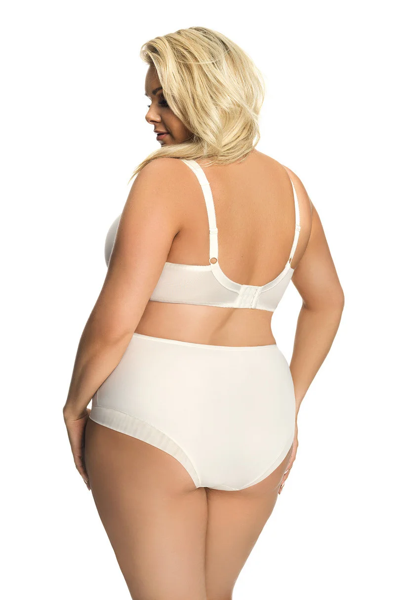 Senzační, velmi pohodlná měkká podprsenka v béžové barvě. Košíčky dobře sbírají poprsí, drží ho na místě a pěkně odhalují dekolt. Spodní části košíčků jsou vyrobeny ze stabilního matného úpletu. Horní část je vyrobena z průsvitného tylu, na kterém je našita krásná, jemná elastická krajka. Košíčky a střed podprsenky z hladšího úpletu a tylu. Košíčky jsou tvarované drátkem kolem prsou. Celkový efekt je, že prsa jsou dokonale shrnutá dovnitř, pozvednutá a udržují si krásný, zaoblený tvar.Široké boky jsou vyrobeny z pevného lycrového úpletu a navíc jsou vybaveny svislými kosticemi, které zajišťují, že podprsenka zůstane na svém místě. Velkou výhodou podprsenky jsou všitá rozšířená ramínka, která jsou pohodlná při nošení. Popruhy jsou nastavitelné, neodnímatelné, různé šířky v závislosti na velikosti. Zapínání: třípolohový háček, dvouřadý a třířadý v závislosti na velikosti. Zloženie: 90 % polyamid, 7 % elastan, 3 % polyester