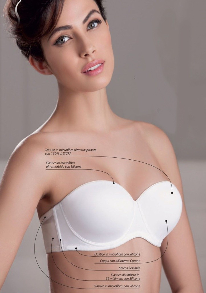 Dámska, mierne vystužená korzetové podprsenka od značky Leilieve. Podprsenka je po celom vnútornom obvode opatrená dvoma radmi silikónových pásikov, ktoré zabezpečujú držanie korzetové podprsenky i bez ramienok. Podprsenka má vyšší stred pre lepšie držanie poprsia. Súčasťou balenia sú látkové aj silikónové ramienka.
