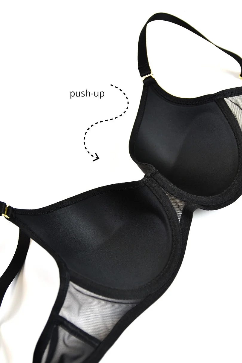 Hladká dámska podprsenka s tvarovanými košíčkami a ramienkami, ktoré je možné odopnúť. Košíčky sú vyrobené z peny a v spodnej časti sú ľahko vyplnené, a preto poprsie zľahka nadnáša smerom nahor. Prednosťou tohto modelu je možnosť odopnúť ramienka. Medzi prednosti patrí tiež široký výber veľkostí a rozmerov. Zlaté detaily dodávajú modelu eleganciu a zvýrazňujú neobyčajný vzhľad tejto podprsenky. Boky modelu sú ušité zo stabilnej sieťoviny. Model nemá bočné kostice, čo zvyšuje pocit pohodlia pri nosení. Zloženie: 85% polyamid, 10% elastan, 5% polyester.