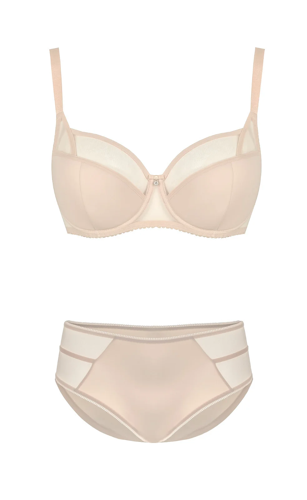 Dámska polovystužená podprsenka, ktorá je vyrobená z hladkého mikrovlákna. Vrchná línia modelu a boky sú ušité z jemnej tylovej sieťoviny. Boky sú spevnené zvislými kosticami. V mieste spojenia košíčkov je saténová mašlička a lesklý kamienok. Košíčky sú na vnútornej strane pokryté bavlnou. Ramienka nie je možné odopnúť. Zloženie: 60% polyamid, 20% elastan, 17% polyester, 3% bavlna.