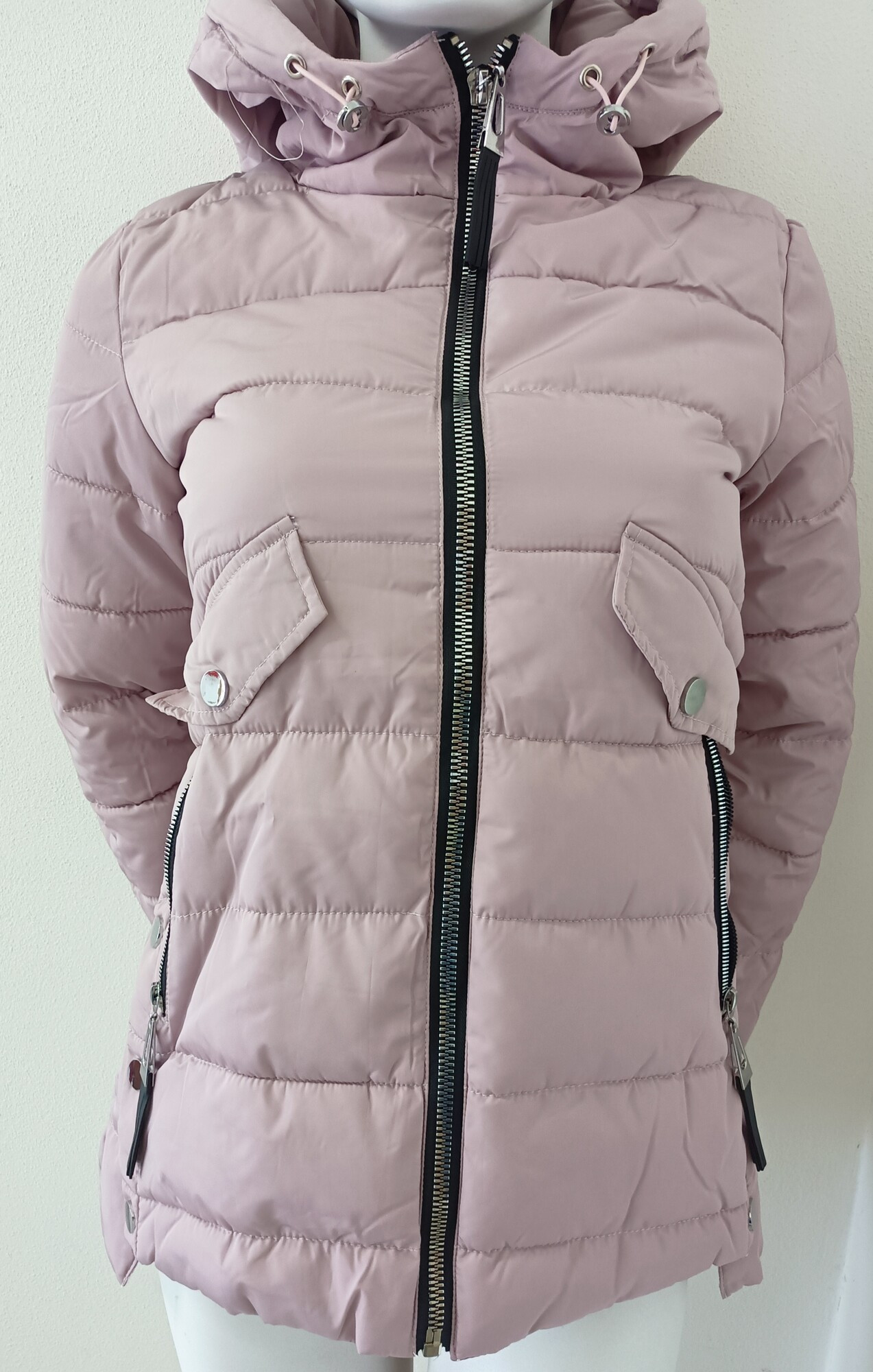 Dámska prešívaná zimná bunda strednej dĺžky s neodnímateľnou kapucňou. Bočné vrecká na zips. Ozdobné odnímateľné cvočky na bokoch. Materiál: 100% polyester
