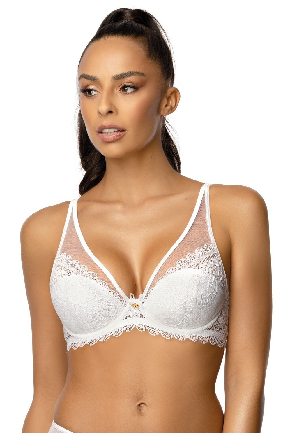 Push-up podprsenka - z bielej čipky a jemnej sieťoviny - na podprsenke - vyberateľné špongie - sedlo s mašľou a bižutérnym prvkom - ramienka s tylovým predĺžením, neodnímateľné, nastaviteľné - čipkový obvod - dve zapínania na háčiky a slučky s trojstupňovým nastavením Zloženie: 42 % polyamid, 22 % bavlna, 15 % polyester, 19 % polyuretán, 2 % elastan