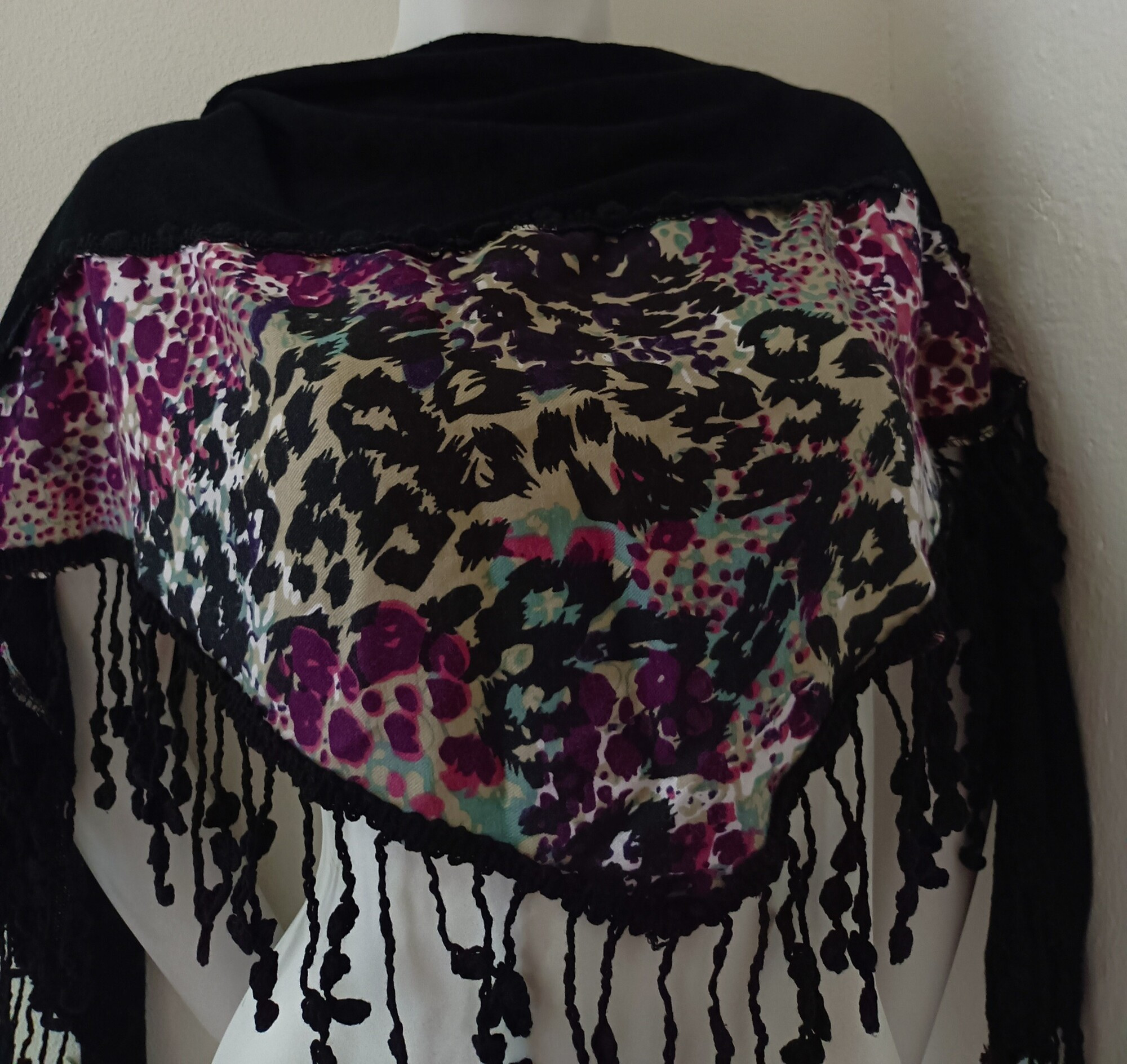 Dámska čiernofialová trojuholníková šatka so strapcami po okrajoch. Materiál: 100% akryl