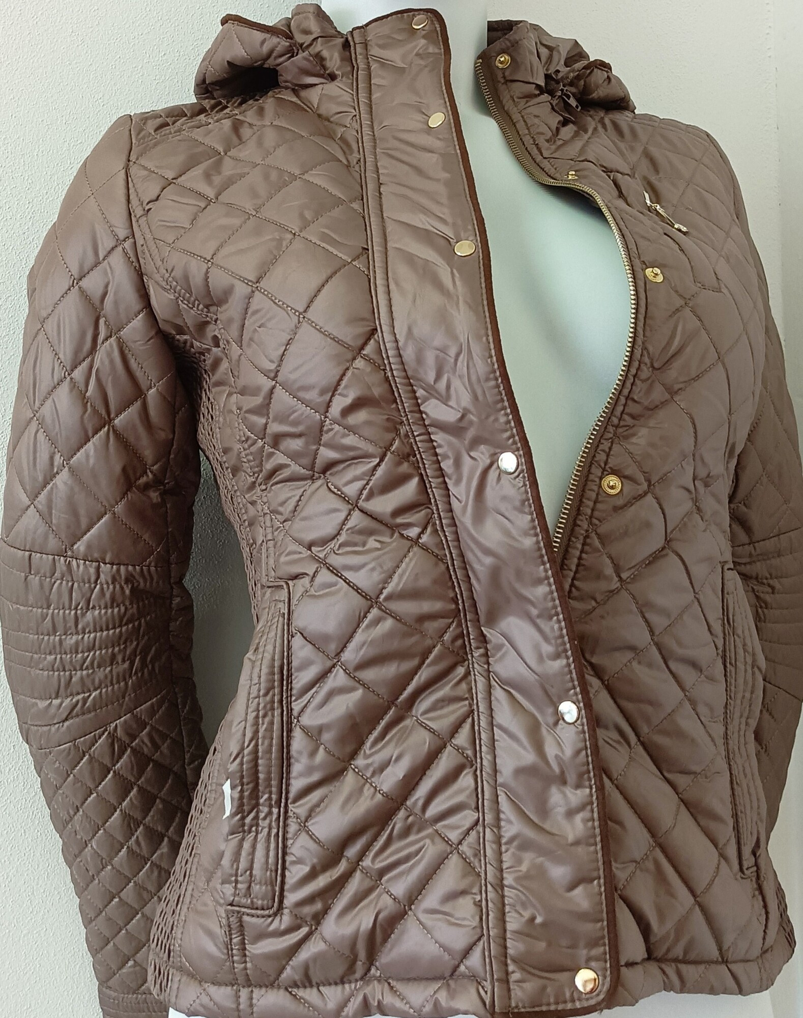 Dámska bunda vhodná na jar alebo jeseň, s podšívkou, s odnímateľnou kapucňou. Zapínanie na zips, ktorý je prekrytý légou s cvočkami. Ušitá vysoko ku krku. Bočné vrecká na zips. Ozdobný zips na hrudi. Rafinované prešívanie, veľmi elegantné. Zapínanie na cvočky na rukávoch. Materiál: 100% polyester