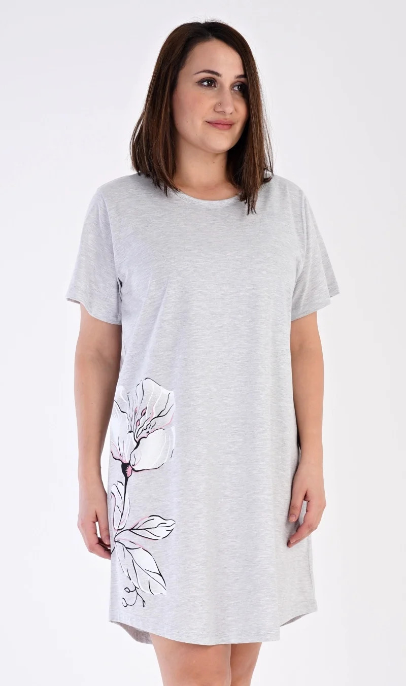 Dámska nočná košeľa Nicol s krátkym rukávom. Nočná košeľa s okrúhlym výstrihom má v spodnej časti boku obrázok kvetu. Použitý materiál je príjemný a pružný na dotyk. 100 % podiel bavlny je v prípade lososovej farby a 70 % v prípade svetlosivej farby. Pokyny na údržbu: -70 % bavlna, 30 % polyester- možno prať v práčke do 30°- nesušiť v sušičke- žehliť na rubovej strane do 110°- nepoužívať bieliace prostriedky- nečistiť chemicky Rozmery namerané na výrobku: 2121460000 Nicol 1XL 2XL 3XL 4XL obvod hrudníka 122 124 130 136 obvod bokov 128 128 138 142 dĺžka 98 100 102 104