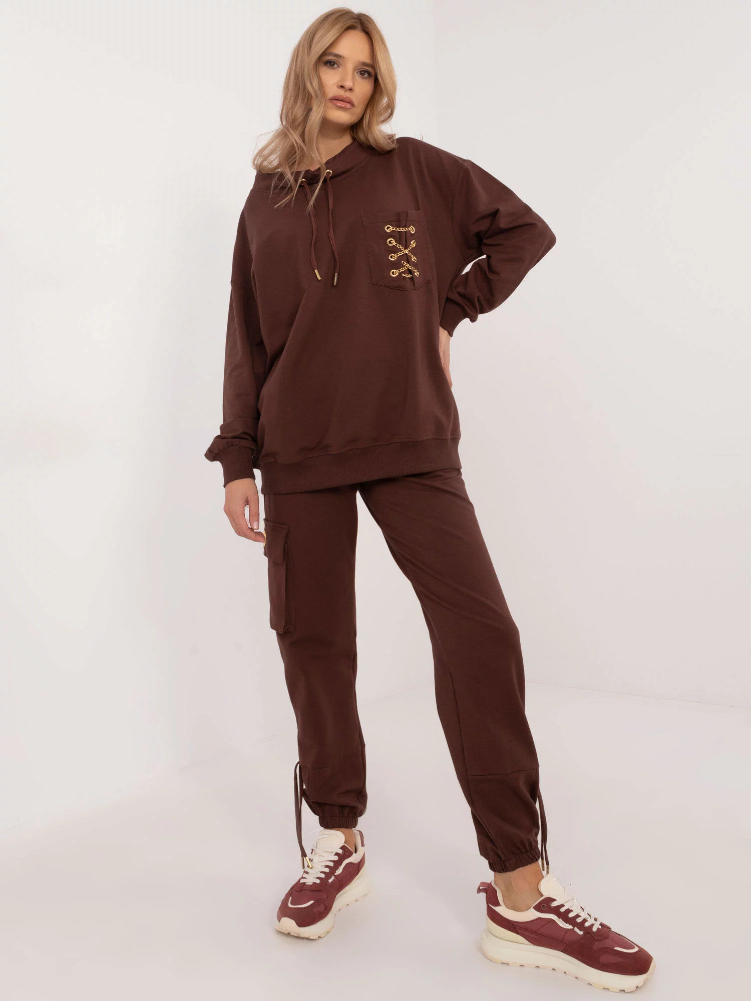 Dámska tepláková súprava so zlatým zdobením na vrchnej časti. Dlhé rukávy, dlhé nohavice. Materiál: 95% bavlna, 5% elastan Modelka má na sebe veľkosť S. Miery modelky: výška 175 cm, prsia 90 cm, pás 66 cm, boky 94 cm. rozmery súpravy vo veľkosti S merané na plocho: šírka v podpazuší - 60 cm, dĺžka blúzky - 68 cm, dĺžka rukávov - 53 cm (od švu), šírka nohavíc v páse - 34 cm, dĺžka nohavíc - 97 cm Veľkosť alt. Výška Obvod hrudníka Vonkajšia dĺžka rukávov Vonkajšia dĺžka rukávov S 36 160-164 82 59 49 M 38 162-172 86 61 51 L 40 164-174 91 63 53 XL 42 166-178 96 65 55