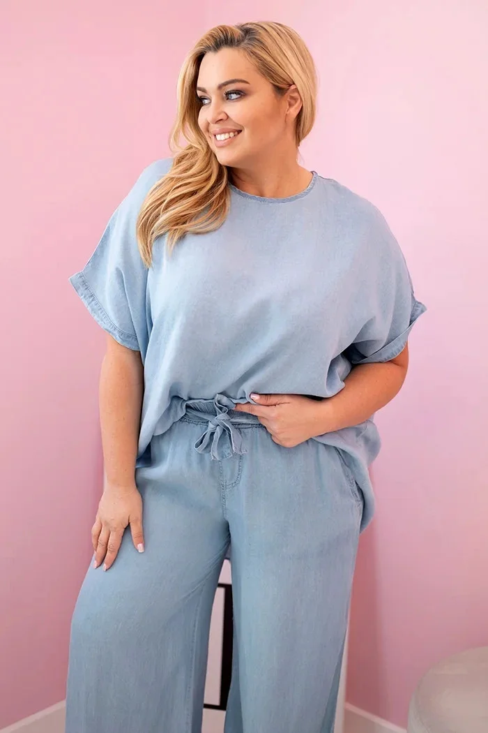 Štýlová a pohodlná dámska súprava Plus Size z prírodného tencelu je ideálnou voľbou na letné a každodenné outfity. Súpravu tvorí voľná blúzka s asymetrickým strihom a nohavice so širokými nohavicami a ozdobným zaväzovaním v páse. Tkanina tencel je mäkká, priedušná a príjemná na dotyk - zaručuje pohodlie aj v tých najhorúcejších dňoch. Voľný strih a elastický pás zaručujú, že súprava dokonale sedí na postave Plus Size, zvýrazňuje prednosti postavy a zakrýva nedostatky. Skvelá voľba na každý deň, dovolenku, do práce alebo na neformálne stretnutia s priateľmi. Model určený pre dámy nosiace veľkosť Plus Size - odporúčané veľkosti XL, XXL, XXXL a väčšie. Vlastnosti výrobku: - Veľký strih, ktorý je vhodný na nosenie, je vhodný na nosenie, na nosenie, na nosenie, na nosenie, na nosenie, na nosenie, na nosenie, na nosenie: Střih: voľný, oversize Štýl: ležérny, mestský, dovolenkový Tkanina: 100 % tencel - priedušná, mäkká a ekologická Blúzka: asymetrická dĺžka, okrúhly výstrih, spadnuté rukávy Nohavice: široké nohavice, elastický pás so zaväzovaním, bočné vrecká Pohodlná súprava ideálna na leto Vyrobené v Taliansku Nižšie uvedené miery sú merané na plocho +/- 1 cm Na zistenie obvodu vynásobte šírku krát 2 Zloženie materiálu: materiál: 100 % Tencel Rozmery: Rozmery: 1,5 × 2,5 × 3,5 cm: Šírka v podpazuší: 76 cm Celková dĺžka: 71 cm (vpredu) / 88 cm (vzadu) Nohavice: Šírka v páse: 39 cm (neroztiahnuté) / 59 cm (roztiahnuté) Šírka v oblasti bokov: 62 cm Celková dĺžka: 101 cm Dĺžka od rozkroku: 70 cm