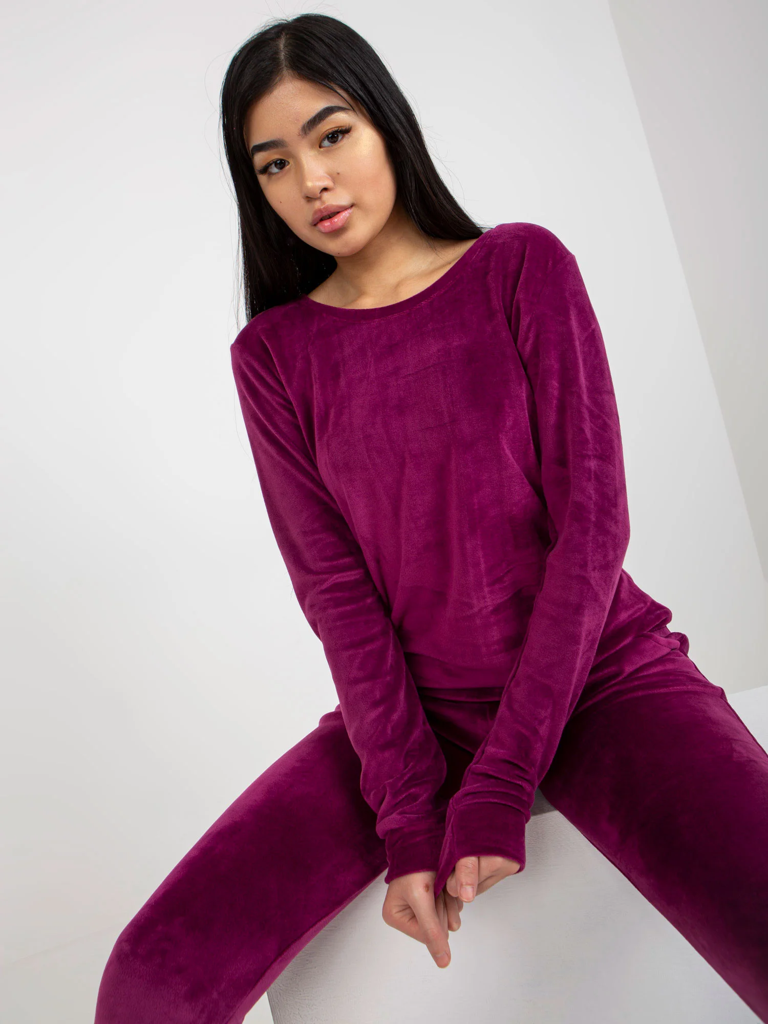 Fialový velúrový set s nohavicami Clarisa RUE PARIS . Kód výrobku: RV-KMPL-6083.05 dominantný vzor: žiadny vzor štýl: ležérny príležitosť: ležérna, mesto, prechádzka, škola Modelka má na sebe veľkosť S. Rozmery modelky: výška 167 cm, prsia 73 cm, pás 64 cm, boky 91 cm. Rozmery súpravy vo veľkosti S merané na plocho: šírka v podpazuší - 45 cm, dĺžka rukávov - 58 cm, dĺžka blúzky - 60 cm, šírka v páse - 35 cm, dĺžka nohavíc - 98 cm.Veľkosť Alt.VýškaObvod hrudníkaVonkajší. dĺžka. rukávVnútorný. dĺžka rukávovS36160-164825949M38162-172866151L40164-174916353