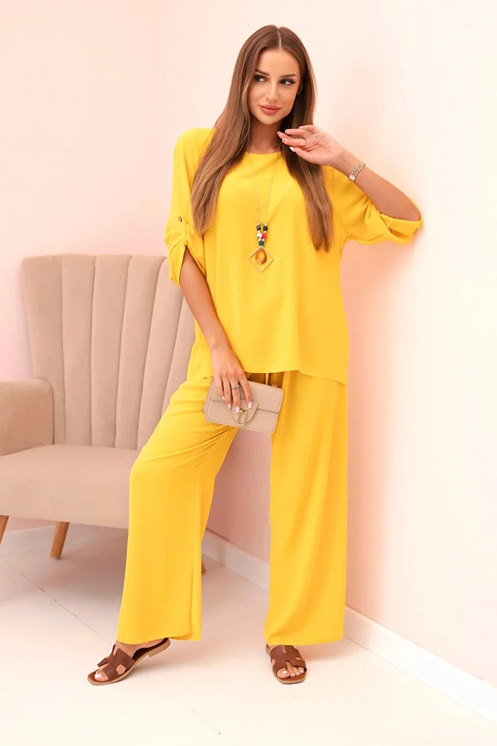 Tento štýlový dámsky komplet je skvelou voľbou pre ženy, ktoré oceňujú pohodlie a eleganciu v každodennom štýle. Komplet obsahuje voľnú blúzku s 3/4 rukávmi, ktoré sa dajú upraviť pomocou gombíka, a široké nohavice s elastickým pásom a šnúrkou na stiahnutie, ktoré zaručujú voľnosť pohybu a skvelé prispôsobenie sa postave. Komplet je doplnený originálnym náhrdelníkom, ktorý dodáva štýlu charakter a osobitý akcent. Komplet je ideálny na bežné nosenie, ako aj na spoločenské stretnutia, prechádzky alebo voľné dni v práci. Vďaka univerzálnemu strihu a neutrálnym farbám ho ľahko zladíte s obľúbenými doplnkami a obuvou. Veľkosť je univerzálna a bude vhodná pre ženy veľkosti S, M alebo L. Vlastnosti výrobku: Vhodný na nosenie v šatách, v ktorých sa dá nosiť: Strih: voľná blúzka, široké nohavice s elastickým pásom a šnúrkou na stiahnutie Materiál: mäkký, elastický, šetrný k pokožke Pohodlie: poskytuje voľnosť pohybu a pohodlie počas celého dňa Funkčnosť: 3/4 rukáv s gombíkom, regulácia v páse Príslušenstvo: súčasťou balenia je ozdobný náhrdelník Štýl: ležérny, každodenný, ideálny na rôzne príležitosti Vyrobené v Taliansku Materiálové zloženie:: materiál: 95 % polyester, 5 % elastanu Nižšie uvedené rozmery sú merané na plocho +/- 1 cmNa zistenie obvodu vynásobte šírku 2x Rozmery: Rozmery: 1,5 x 1,5 x 1,5 x 1,5 cm: Šírka v podpazuší: 58 cm Celková dĺžka: 68 cm Dĺžka rukávu od podpazušia: 28 cm Nohavice: Šírka v páse: 32 cm / po rozopnutí: 48 cm Celková dĺžka: 103 cm Dĺžka od rozkroku: 70 cm Šírka v oblasti bokov: 63 cm