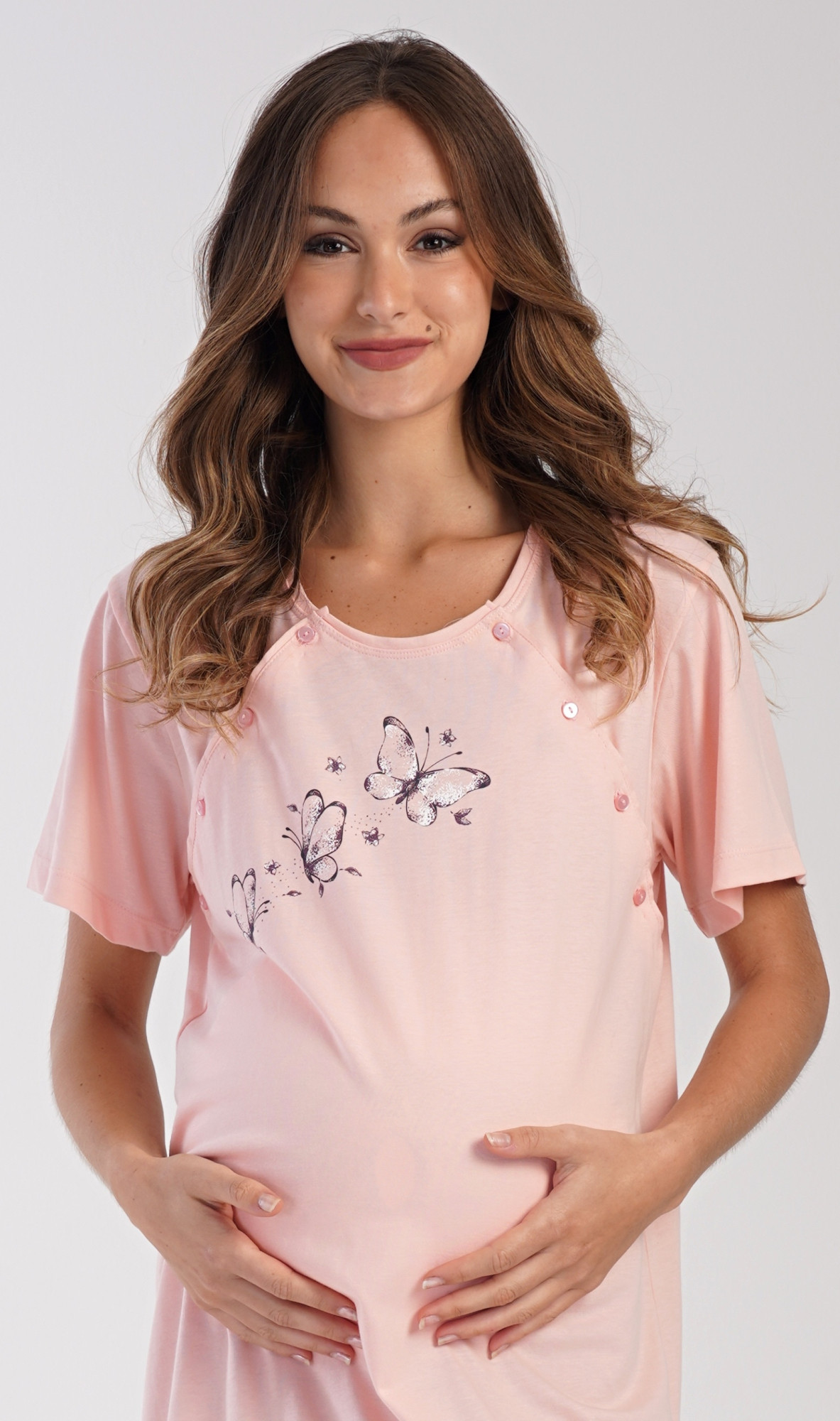 Dámská bavlněná mateřská noční košile s krátkým rukávem Butterfly. Noční košile je svým střihem určená na dobu těhotenství, do porodnice i ke kojení. Ke kojení slouží průstřihy po stranách košile, které jsou uzavíratelné na knoflíky. Jednobarevná košile je ozdobena obrázkem motýlků. Použitý materiál s podílem bavlny 100% je příjemný a poddajný na dotek. Pokyny pro údržbu: - 100% bavlna - lze prát v pračce při teplotě do 30° - nesušit v sušičce - žehlit z rubu do 110° - nepoužívat bělící prostředky - nečistit chemicky Míry naměřené na výrobku 4032500000 Butterfly S M L XL obvod hrudníku 96 100 106 110 obvod boky 100 104 110 114 délka 95 95 95 95