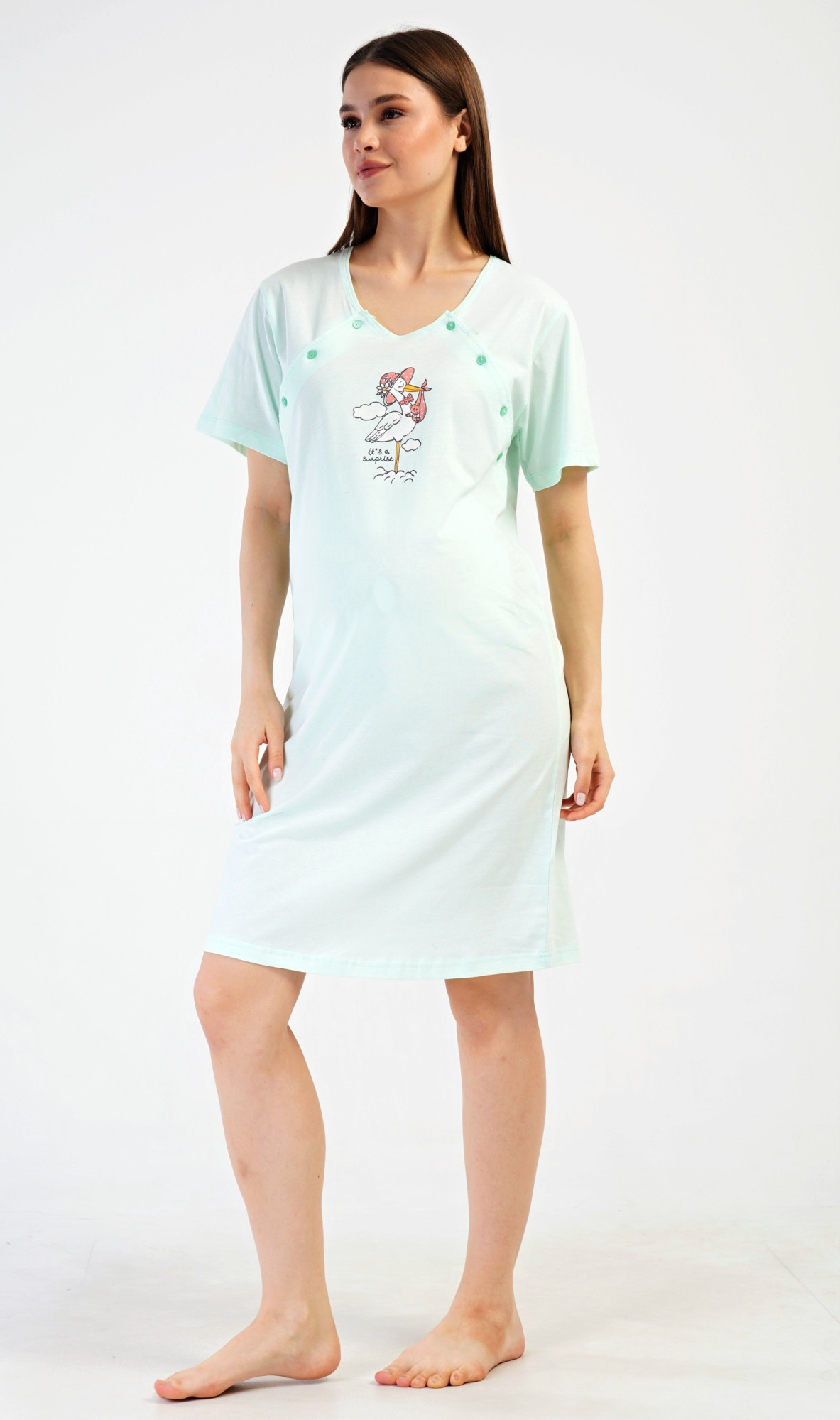 Dámská bavlněná mateřská noční košile Čáp s kloboukem. Noční košile je svým střihem určená na dobu těhotenství, do porodnice i ke kojení. Ke kojení slouží průstřihy po stranách košile, které jsou uzavíratelné na knoflíky. Jednobarevná košile je na hrudi ozdobena obrázkem čápa, který má v zobáku miminko. Použitý materiál s podílem bavlny 100% je příjemný a poddajný na dotek. Pokyny pro údržbu: - 100% bavlna- lze prát v pračce při teplotě do 30°- nesušit v sušičce- žehlit z rubu do 110°- nepoužívat bělící prostředky- nečistit chemicky Míry naměřené na výrobku: 4101350000 Čáp s klo.b. M L XL XXL obvod hrudníku 100 104 110 114 obvod boky 102 106 116 120 délka 98 96 96 96
