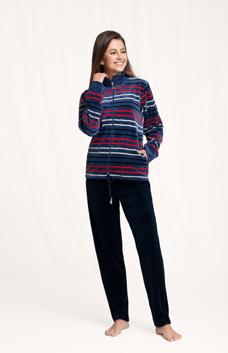 Dámska tepláková súprava z velúru, ideálna na doma aj na tréning, pruhovaná blúzka s jednotným výstrihom, zapínaním na zips a praktickými vreckami a jednotné nohavice s rovným strihom a rebrovanými manžetami. Zloženie: 82 % bavlna, 18 % polyester .