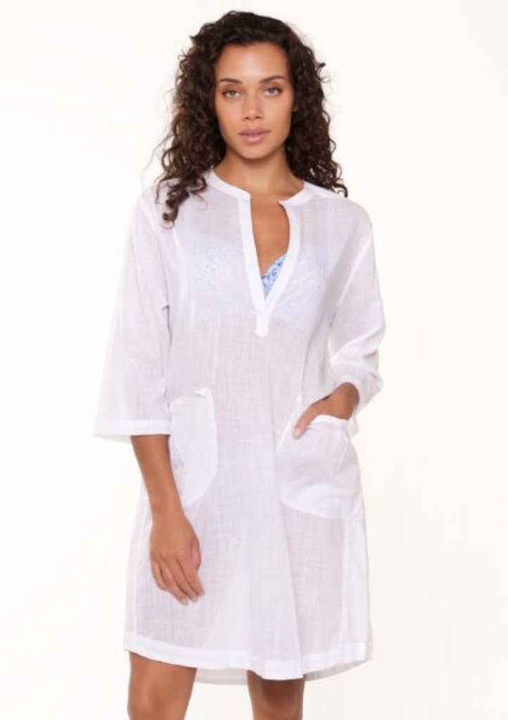 Dámska tunika od LingaDore. Tunika je polopriehľadná, vhodná na pláž aj k bazénu. Materiál je veľmi priedušný, vyrobený zo 100 % bavlny. Voľná tunika má 3/4 rukávy s možnosťou vyhrnutia a zapínania na gombík. Tunika má dĺžku po kolená a véčkový výstrih s prešívaným lemom. Na prednej strane sú po stranách našité vrecká. Zloženie materiálu: 100 % bavlna