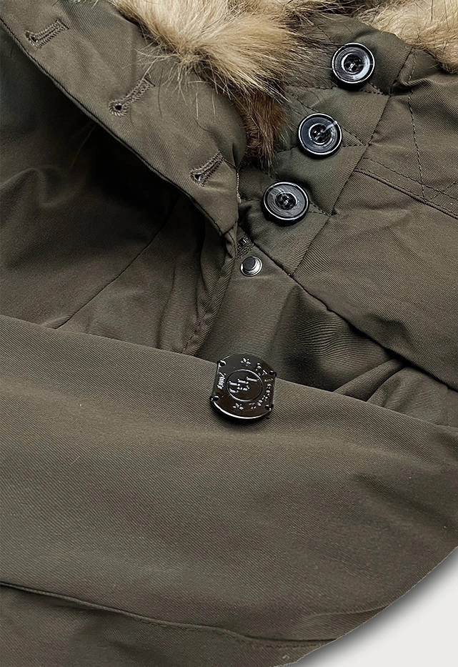 Pri výbere veľkosti venujte pozornosť nižšie uvedenej veľkostnej tabuľke. Veľkosti nezodpovedajú bežne nosenému oblečeniu. Bunda s kapucňou, ktorú možno odopnúť Bunda je zateplená syntetickou páperovou výplňou a vo vnútri je zateplená machovou kožušinou na chrbte. Model má štyri vrecká a zapína sa na zips a panel s patentkami. Bunda má kapucňu, ktorú možno odopnúť na ramenách ako golier. Model má aj vysoký stojačik so zapínaním na gombíky. Model má v páse sťahovacie šnúrky. Bunda je dlhá do polovice stehien. Materiál: 100 % polyester.