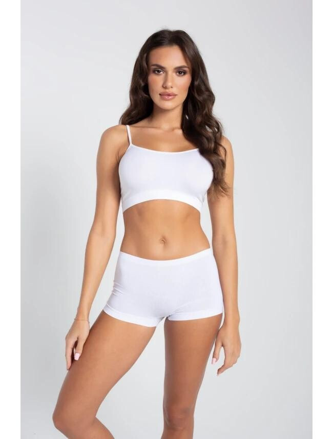 Bezšvové dámske nohavičky - šortky, ktoré sú vyrobené z mäkkej a priedušnej bavlny. Nohavičky majú ploché okraje. Model pri nosení netlačí a nekrčí sa pod oblečením. V páse je lemovaný jemnou šnúrkou. Nohavičky sa ideálne prispôsobia telu, sú priliehavé a veľmi pohodlné pri nosení. 86 % bavlna, 9 % polyamid, 5 % elastan.