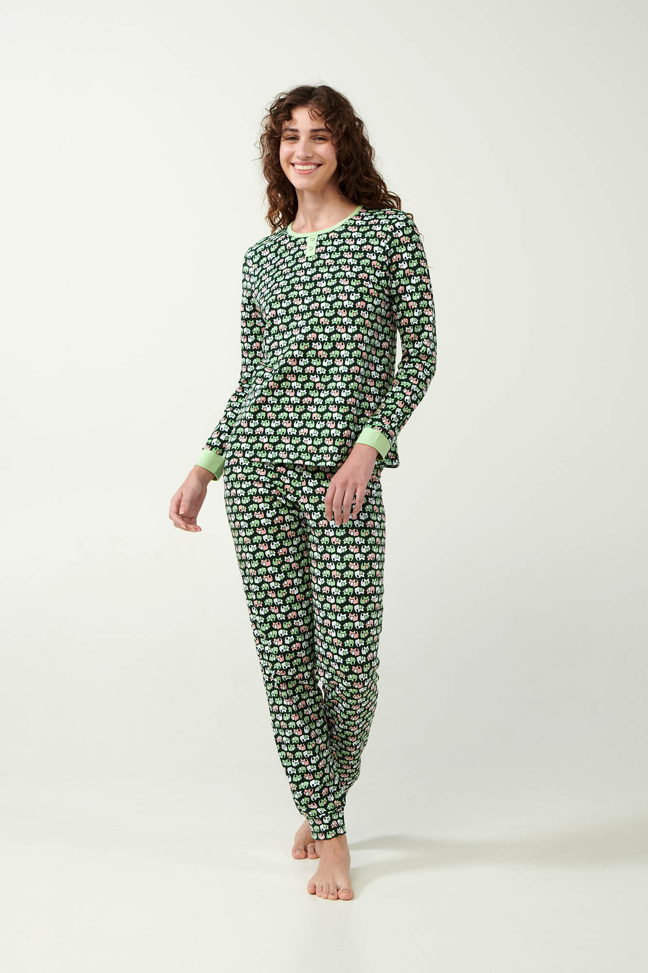 100% bavlna Interlock Dĺžka vrchného dielu: 65 cm. Model: výška 175 cm, veľkosť: Small. Vneste do svojho spacieho oblečenia nádych exotiky s naším pyžamom s potlačou indického slona. Toto pyžamo so žiarivým vzorom slona v sýtom smaragdovom základe je vyrobené zo 100 % bavlny interlock, ktorá zaručuje vynikajúcu mäkkosť a odolnosť. Súprava obsahuje vrchný diel s okrúhlym výstrihom, rukávy s manžetami a zodpovedajúce nohavice s manžetami, ktoré sú navrhnuté v regular strihu pre každodenné pohodlie. Toto pyžamo je ideálne na pohodlné noci alebo uvoľnené rána, spája hravý štýl s luxusným pohodlím.