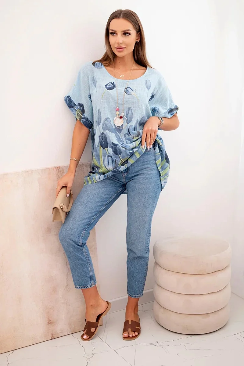 Domov Oblečenie a móda Dámske oblečenie Dámske blúzky a košele Dámske bavlnené tričko s kvetinovým vzorom modré UNI