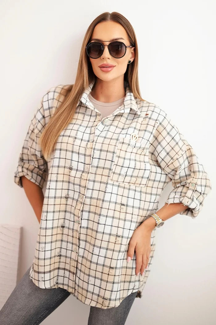 Dámska kockovaná košeľa je ideálnou voľbou pre ženy, ktoré ocenia módny vzhľad a pohodlie na každodenné nosenie. Model je vyrobený z mäkkej a príjemnej zmesi bavlny a polyesteru, vďaka čomu sa skvele nosí a hodí sa na každé ročné obdobie.Košeľa má klasický golier, zapínanie na gombíky a náprsné vrecko. Pozornosť upúta módny obnosený efekt, ktorý jej dodáva charakter a moderný štýl. Voľnejší strih zaručuje voľnosť pohybu a vďaka predĺženému zadnému dielu vyzerá skvele k džínsom aj legínam.Je to výborná voľba na každý deň, do práce, na stretnutie s priateľmi alebo na prechádzku po meste. Košeľa bude skvelým základom pre mnohé ležérne štylizácie.Veľkosť je univerzálna a bude vhodná pre dámy vo veľkosti S, M alebo L.Vlastnosti výrobku: Vhodná na nosenie v šatách, v nohaviciach a na ramienkach: Klasický strih s golierom Zapínanie na gombíky Ozdobný károvaný vzor s efektom nosenia Náprsné vrecko s ozdobnou brošňou Rukávy s 3/4 dĺžkou Mäkký a pohodlný materiál Talianska výroba Rozmery a zloženie: Dĺžka a zloženie sú uvedené v tabuľke a sú merané na plocho +/- 1 cmŠírku vynásobte 2, aby ste získali obvodovú mieru Šírka v podpazuší: 62 cm Celková dĺžka (vpredu): 81 cm Dĺžka rukáva od ramena: 36 cm Zloženie materiálu: materiál: 65 % bavlna 35% polyester