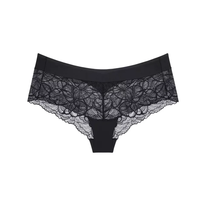 Šortky so zvýšeným strihom s bezšvovou technológiou a hladkým elastickým pásom pre pocit druhej kože. Spodná časť z jemnej čipky a krémovo mäkkého mikrovlákna, čiastočne recyklované. Maximálne krycie krátke nohavičky s moderným zadným dielom. Vďaka úprave HeiQ Smart Temp na mikrovlákne zostáva pokožka chladná a pohodlná-. Hladký a neviditeľný pás a špeciálne švy zabraňujú skĺznutiu. Kombinácia hladkej čipky a zamatovo jemného mikrovlákna. Zloženie