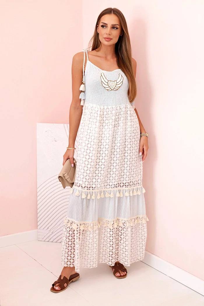 Tieto dámske šaty v boho štýle sú skvelou voľbou na teplé dni, keď chcete vyzerať žensky, ležérne a štýlovo. Sú vyrobené zo 100 % bavlny, čo zaručuje pohodlie a priedušnosť počas celého dňa. Vrchnú časť šiat zdobí výšivka v tvare krídla a ozdobné šnúrky s okrajmi na ramienkach, ktoré modelu dodávajú jedinečný charakter. Spodná časť z jemnej čipky s geometrickým vzorom, pretkaná volánmi s okrajmi, podčiarkuje ľahkosť a romantický štýl. Ideálna voľba na letné prechádzky, dovolenku alebo festivaly. Šaty vyzerajú skvele so sandálkami, espadrilkami alebo papučkami. Veľkosť je univerzálna a padne dámam s veľkosťou S, M alebo L. Vlastnosti výrobku: Šaty sú vhodné na nosenie v šatách s dlhým rukávom, ktoré sú vhodné na nosenie v šatách s dlhým rukávom: Strih: voľný, dlhý, nastaviteľné ramienka Materiál: prírodná bavlna - priedušná a pohodlná Štýl: boho, romantický Detaily: výšivka na hrudi, čipka, strapce, volániky Pohodlie: ľahké a priedušné Vyrobené v Taliansku Zloženie materiálu: materiál: 100 % bavlna Nižšie uvedené rozmery sú merané na plocho +/- 1 cm ak chcete získať obvod, vynásobte šírku číslom 2 Rozmery: Šírka v páse: 42 cm Šírka v oblasti bokov: 64 cm Celková dĺžka: 130 cm