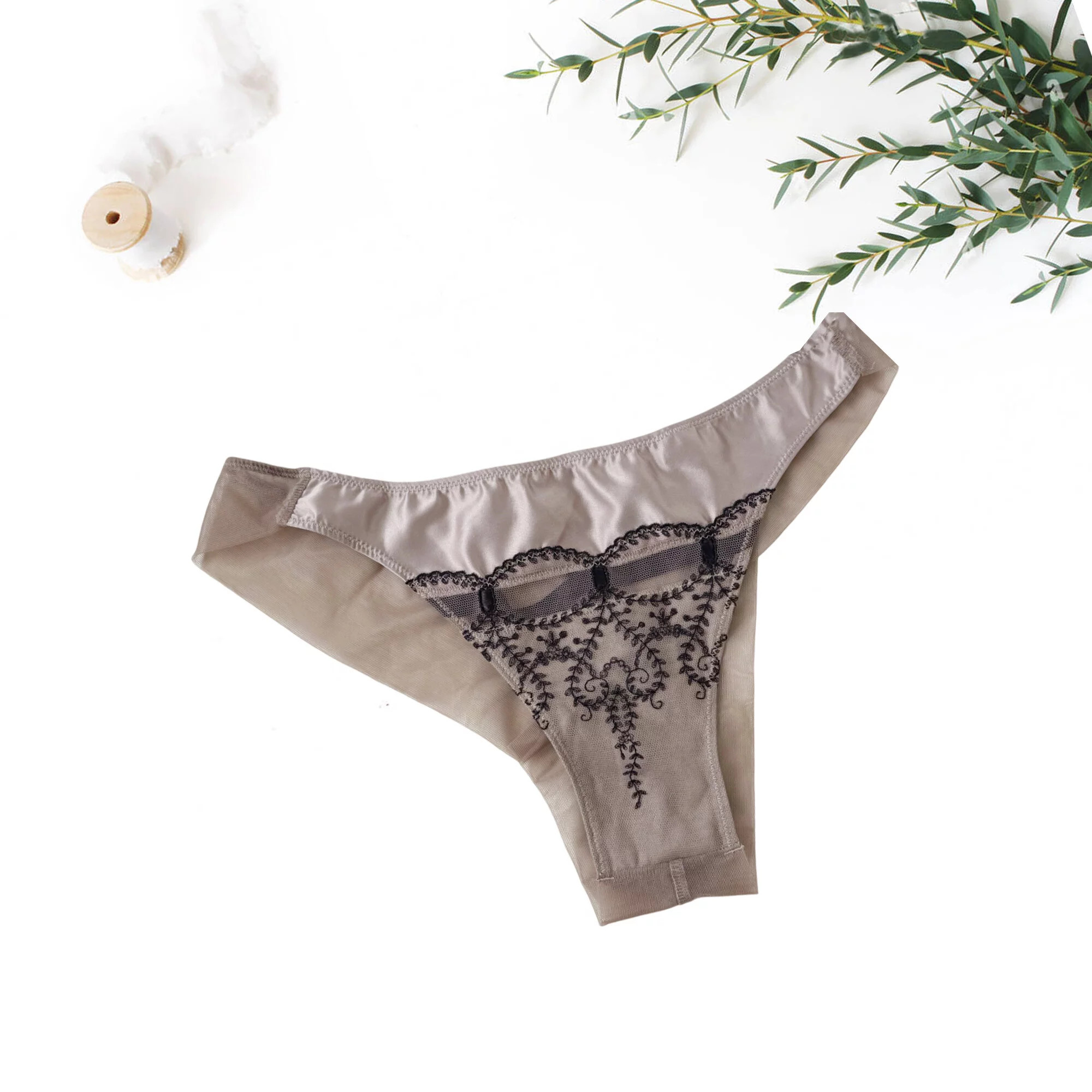 Dámske nohavičky s podprsenkou, vyrobené z tylu s ozdobnou stuhou v zadnej časti a saténu s čipkou v prednej časti. 38 % polyamid, 34 % polyester, 21 % bavlna, 7 % elastan